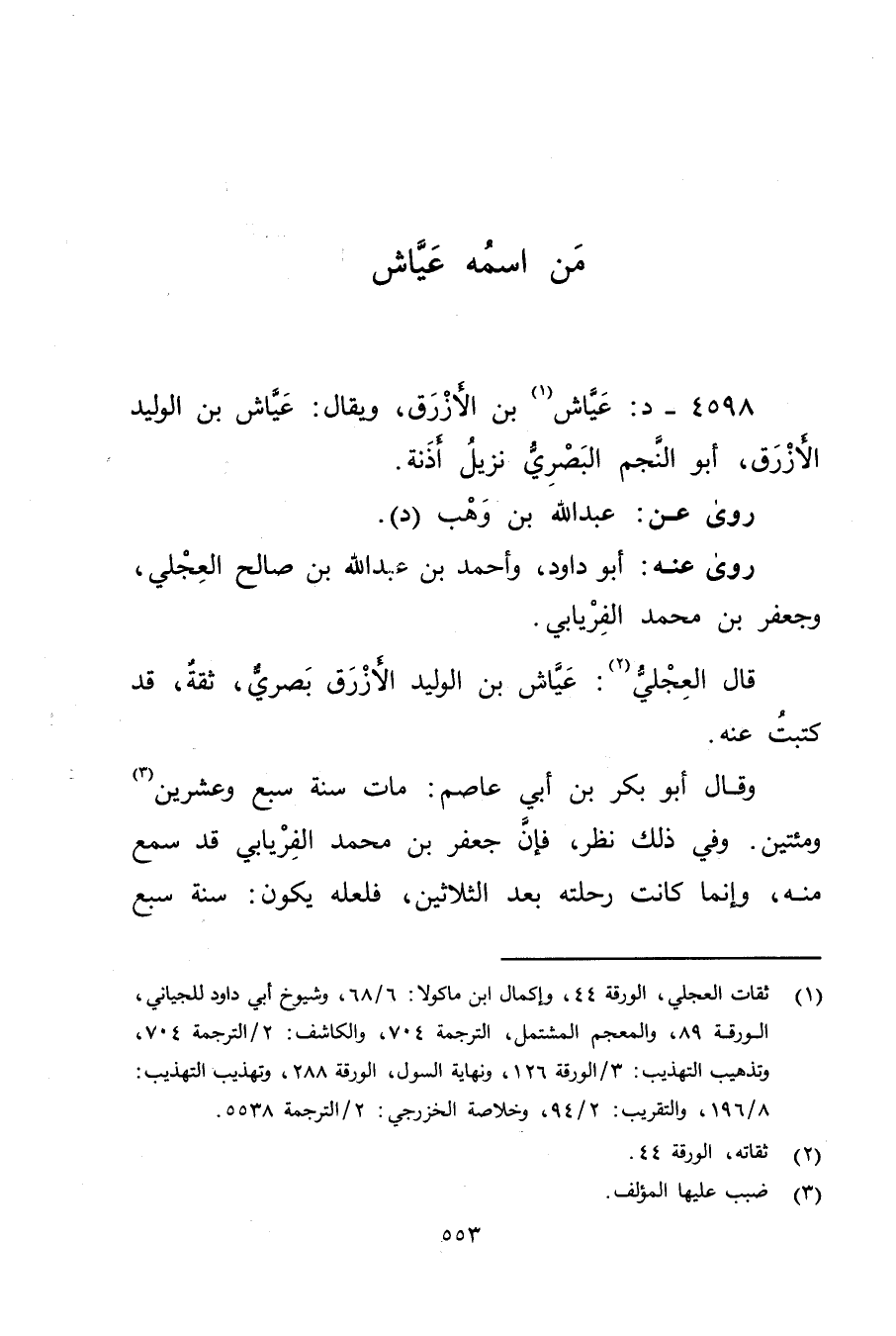 (1) ثقات العجلي، الورقة 44، وإكمال ابن ماكولا: 6 / 68، وشيوخ أبي داود للجياني، الورقة 89، والمعجم المشتمل، الترجمة 704، والكاشف: 2 / الترجمة 704، وتذهيب التهذيب: 3 / الورقة 126، ونهاية السول، الورقة 288، وتهذيب التهذيب: 8 / 196، والتقريب: 2 / 94، وخلاصة الخزرجي: 2 / الترجمة 5538.