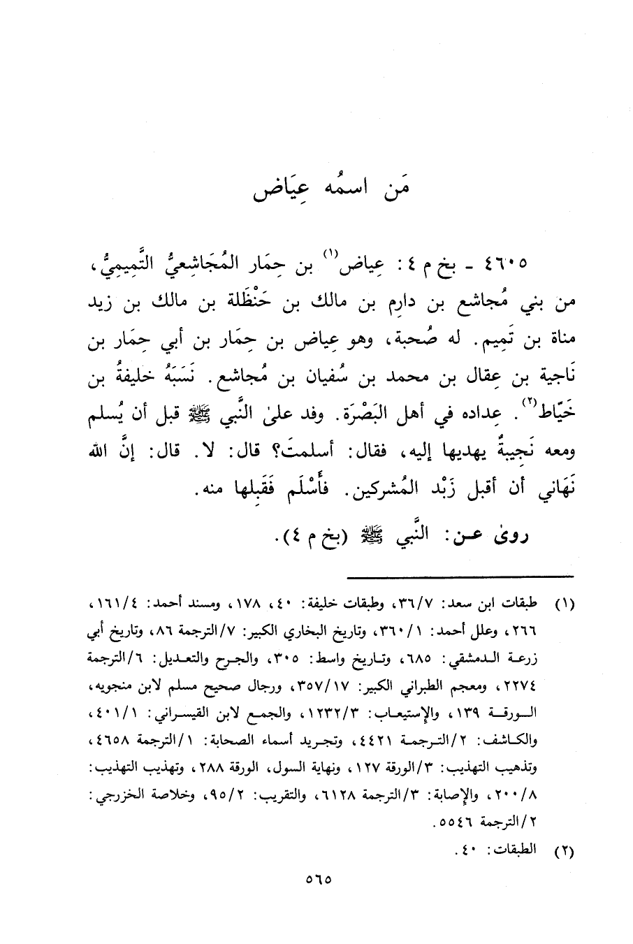 4605 - بخ م 4: عياض بن حمار المجاشعي التميمي (1) ، من بني مجاشع بْن دارم بْن مالك بْن حنظلة بْن مَالِك بْن زَيْد مناة بْن تميم. لهُ صُحبَةٌ، وهو عياض بْن حمار بْن أَبي حمار بن ناجية بن عقال بن محمد بن سفيان بن مجاشع. نسبه خليفة بْن خياط (2) . عداده في أهل البصرة. وفد على النَّبِيُّ صلى الله عليه وسلم قبل أن يسلم ومعه نجيبة يهديها إليه، فقال: أسلمت؟ قال: لا. قال: إن اللَّه نهاني أن أقبل زبد المشركين. فأسلم فقبلها منه.