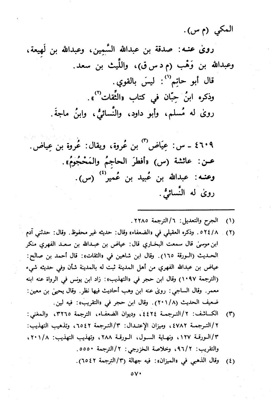 (3) الكاشف: 2 / الترجمة 4424، وديوان الضعفاء، الترجمة 3265، والمغني: 2 / الترجمة 4782، وميزان الاعتدال: 3 / الترجمة 6542، وتذهيب التهذيب: 3 / الورقة 127، ونهاية السول، الورقة 288، وتهذيب التهذيب: 8 / 201، والتقريب: 2 / 96، وخلاصة الخزرجي: 2 / الترجمة 5550.