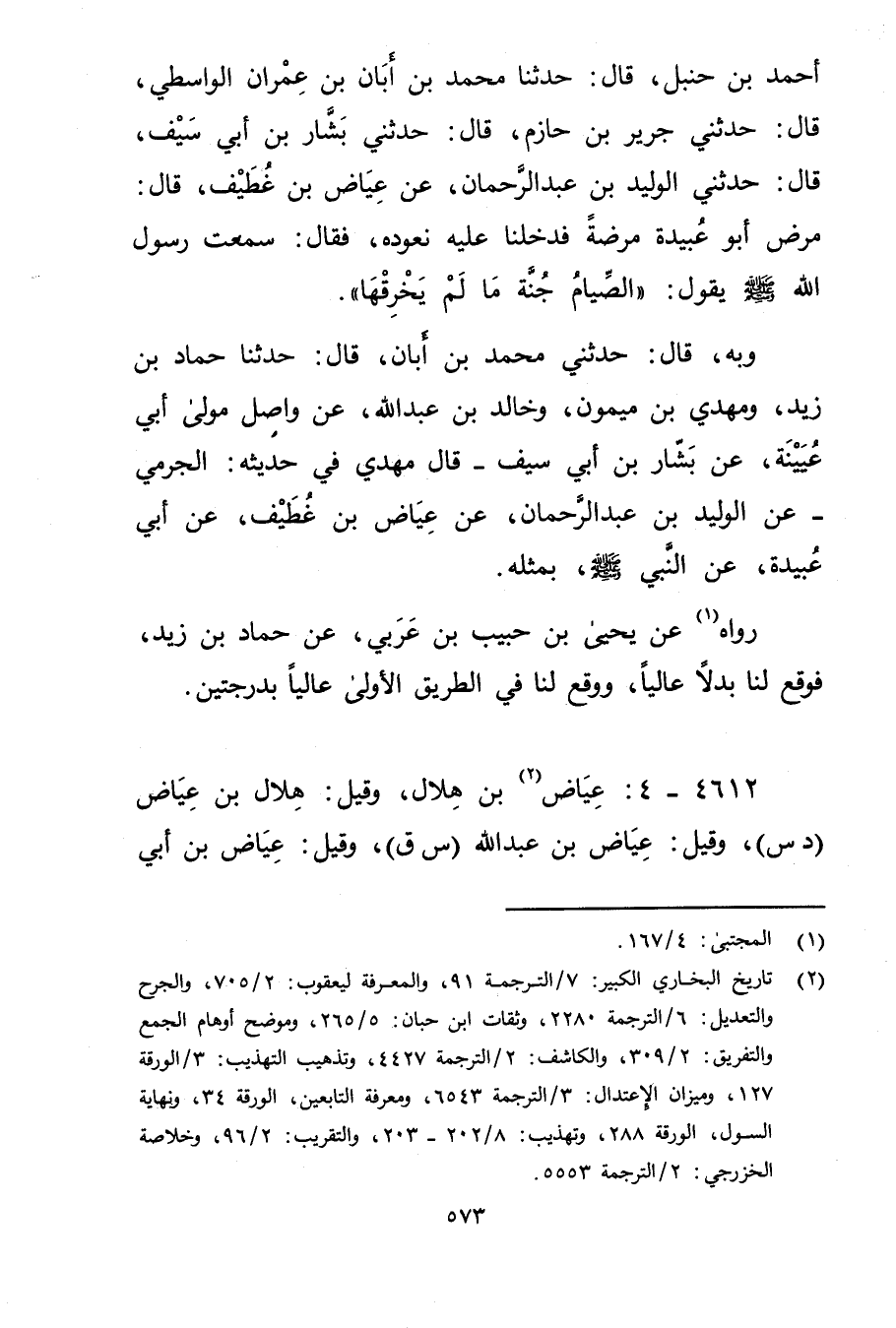 أَحْمَد بْن حنبل، قال: حَدَّثَنَا مُحَمَّدُ بْنُ أَبَانِ بْنِ عِمْران الْوَاسِطِيُّ، قال: حَدَّثَنِي جَرِيرُ بْنُ حَازِمٍ، قال: حَدَّثَنِي بَشَّارُ بْنُ أَبي سَيْفٍ، قال: حَدَّثَنِي الْوَلِيدُ بْنُ عَبْدِ الرَّحْمَنِ، عَنْ عِيَاضِ بْنِ غُطَيْفٍ، قال: مَرِضَ أَبُو عُبَيدة مَرْضَةً فَدَخَلْنَا عَلَيْهِ نَعُودُهُ، فَقَالَ: سَمِعْتُ رَسُولَ اللَّهِ صَلَّى اللَّهُ عَلَيْهِ وسَلَّمَ يَقُولُ: "الصِّيَامُ جُنَّةٌ مَا لَمْ يَخْرِقْهَا.