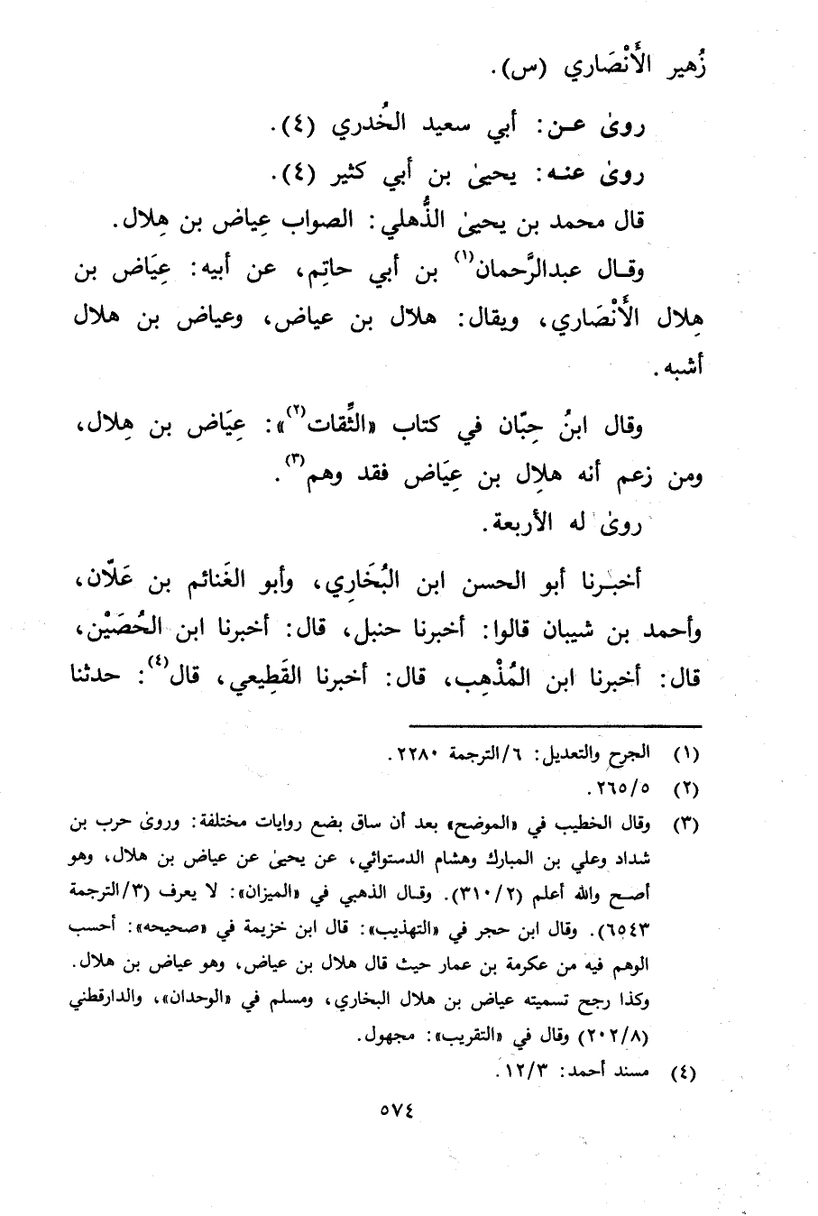وكذا رجح تسميته عياض بن هلال البخاري، ومسلم في "الوحدان "، والدارقطني (8 / 202) وَقَال في "التقريب": مجهول.