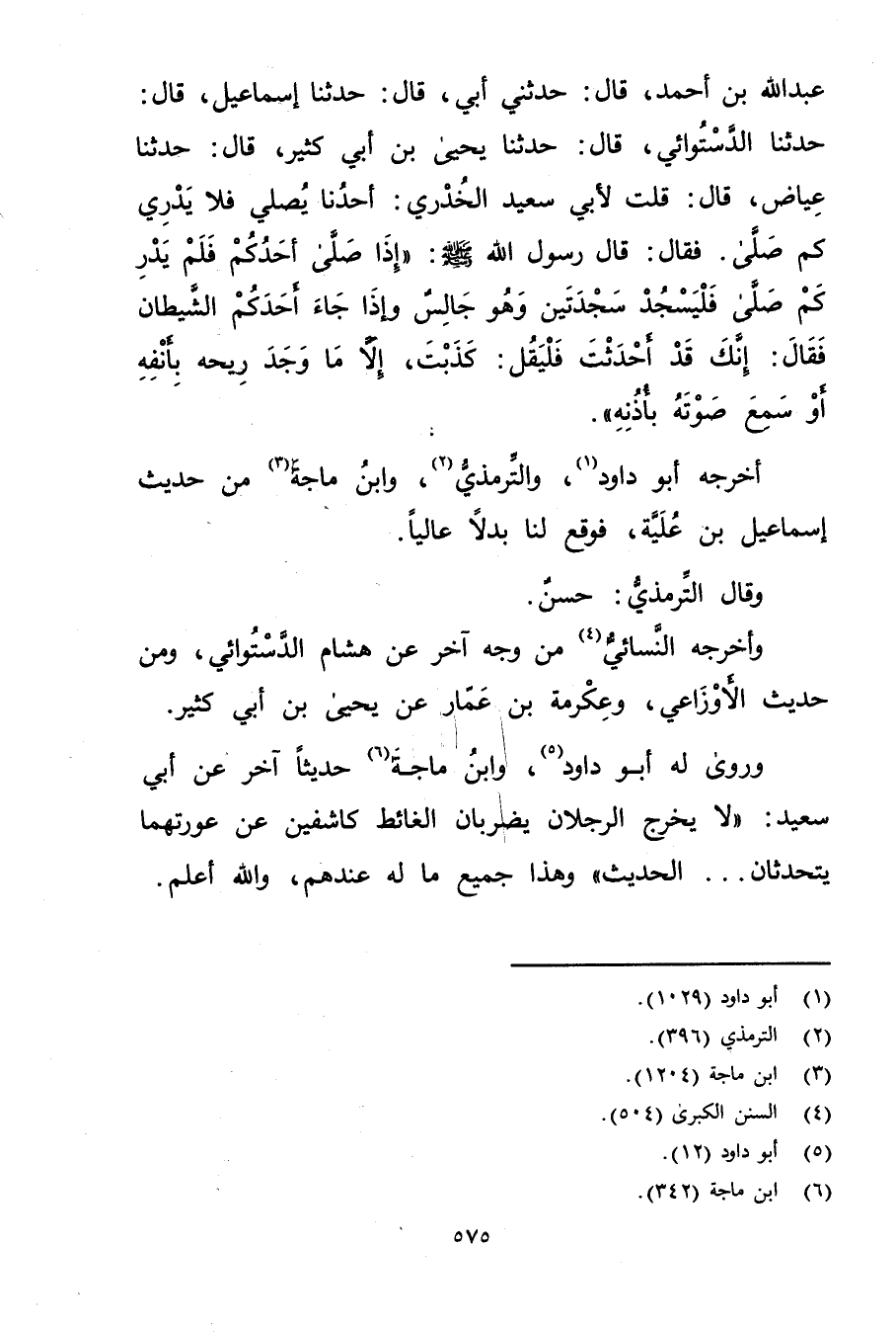 عَبد اللَّهِ بْن أَحْمَدَ، قال: حَدَّثني أَبِي، قال: حَدَّثَنَا إِسْمَاعِيلُ، قال: حَدَّثَنَا الدَّسْتَوَائِيُّ، قال: حَدَّثَنَا يحيى بْن أَبي كثير، قال: حَدَّثَنَا عِيَاضُ، قال: قلتُ لأَبِي سَعِيد الخُدْرِيّ: أَحَدُنَا يُصَلِّي فَلا يَدْرِي كَمْ صَلَّى.