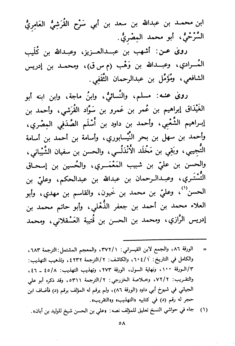 = الورقة 86، والجمع لابن القيسراني: 1 / 372، والمعجم المشتمل: الترجمة 683، والكامل في التاريخ: 1 / 604، والكاشف: 2 / الترجمة 4232، وتذهيب التهذيب: 3 / الورقة 100، ونهاية السول، الورقة 273، وتهذيب التهذيب: 8 / 45 - 46، والتقريب: 2 / 72، وخلاصة الخزرجي: 2 / الترجمة 5311، وقد ذكره أبو علي الجياني في شيوخ أبي داود (الورقة 86) ، ولم يرقم له المؤلف برقم (د) فأضاف ابن حجر له رقم (د) في كتابيه "التهذيب "و "التقريب.