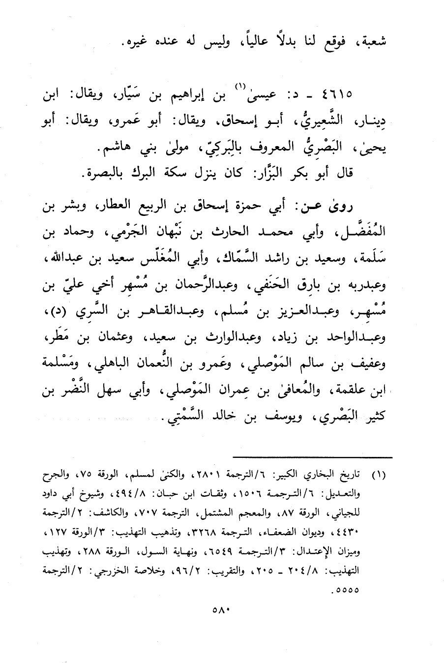 4615 - د: عيسى بن إبراهيم بن سيار (1) ، ويُقال: ابن دينار، العشيري، أَبُو إسحاق، ويُقال: أَبُو عَمْرو، ويُقال: أَبُو يحيى، البَصْرِيّ المعروف بالبركي، مولى بني هاشم.