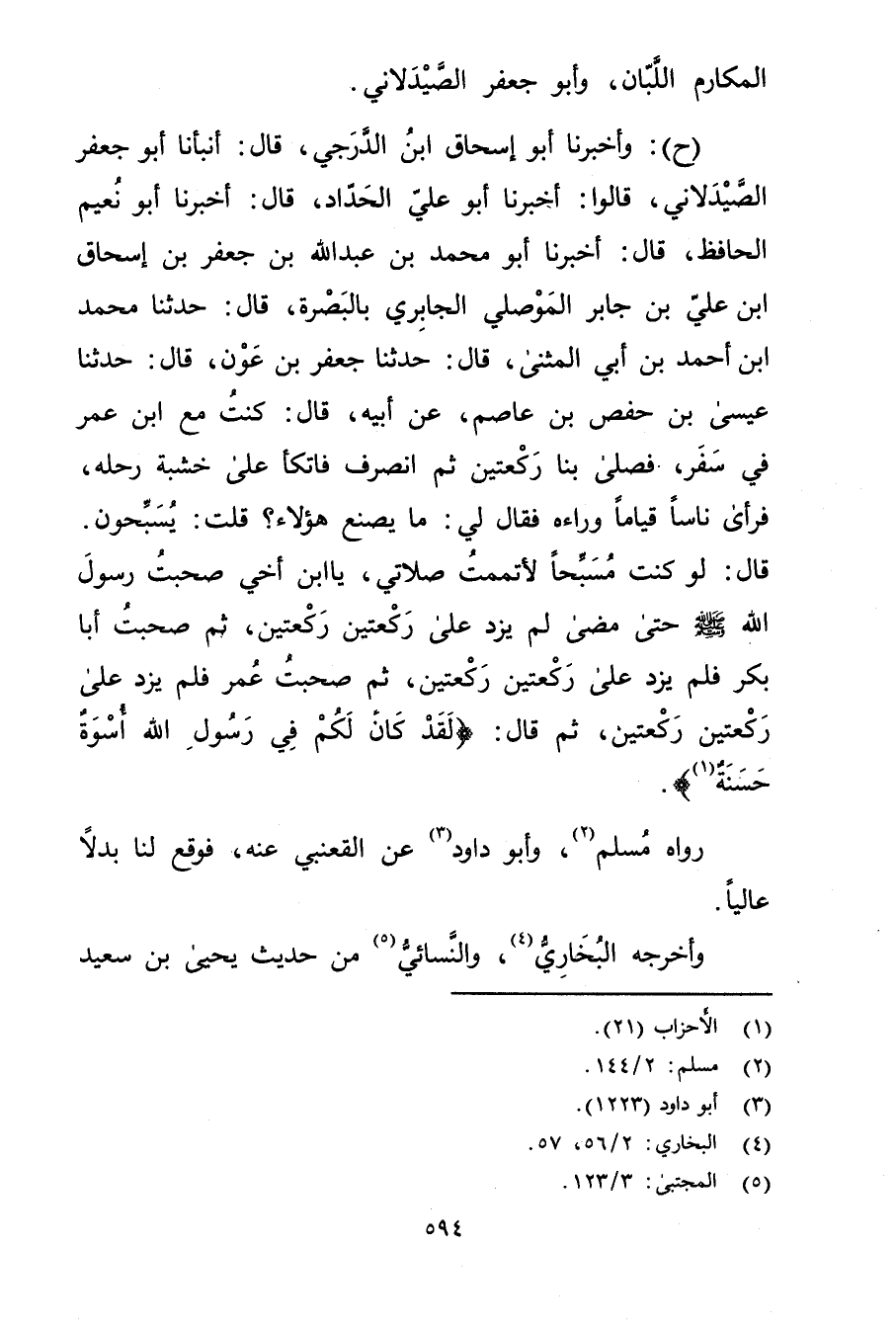 (ح) : وأَخْبَرَنَا أَبُو إِسْحَاقَ ابْنُ الدَّرَجِيِّ، قال: أنبأنا أَبُو جَعْفَرٍ الصَّيْدَلانِيُّ، قَالُوا: أَخْبَرَنَا أَبُو عَلِيٍّ الْحَدَّادُ، قال: أَخْبَرَنَا أَبُو نُعَيْمٍ الْحَافِظُ، قال: أَخْبَرَنَا أَبُو مُحَمَّدِ بْنُ عَبد الله بْن جعفر بْن إسحاق ابن عَلِيِّ بْنِ جَابِرٍ الْمَوْصِلِيُّ الْجَابِرِيُّ بالبصرة، قال: حَدَّثَنَا محمد ابن أَحْمَدَ بْنِ أَبي الْمُثَنَّى، قال: حَدَّثَنَا جَعْفَرُ بْنُ عَوْنٍ، قال: حَدَّثَنَا عِيسَى بْنُ حَفْصِ بْنِ عَاصِمٍ، عَن أَبِيهِ، قال: كُنْتُ مَعَ ابْنِ عُمَر فِي سَفَرٍ، فَصَلَّى بِنَا رَكْعَتَيْنِ ثُمَّ انْصَرَفَ فَاتَّكَأَ عَلَى خَشَبَةِ رَحْلِهِ، فَرَأَى نَاسًا قِيَامًا ورَاءَهُ فَقَالَ لِي: مايصنع هَؤُلاءِ؟ قُلْتُ: يُسَبِّحُونَ. قال: لَوْ كُنْتَ مُسَبِّحًا لأَتْمَمْتُ صَلاتِي، يَا ابْنَ أَخِي صَحِبْتُ رَسُولَ اللَّهِ صَلَّى اللَّهُ عَلَيْهِ وسَلَّمَ حَتَّى مَضَى لَمْ يَزِدْ عَلَى رَكْعَتَيْنِ رَكْعَتَيْنِ، ثُمَّ صَحِبْتُ أَبَا بَكْرٍ فَلَمْ يَزِدْ عَلَى رَكْعَتَيْنِ رَكْعَتَيْنِ، ثُمَّ صَحِبْتُ عُمَر فَلَمْ يَزِدْ عَلَى رَكْعَتَيْنِ رَكْعَتَيْنِ، ثُمَّ قال: {لَقَدْ كَانَ لَكُمْ فِي رَسُولِ اللَّهِ أُسْوَةٌ حَسَنَةٌ (1} .