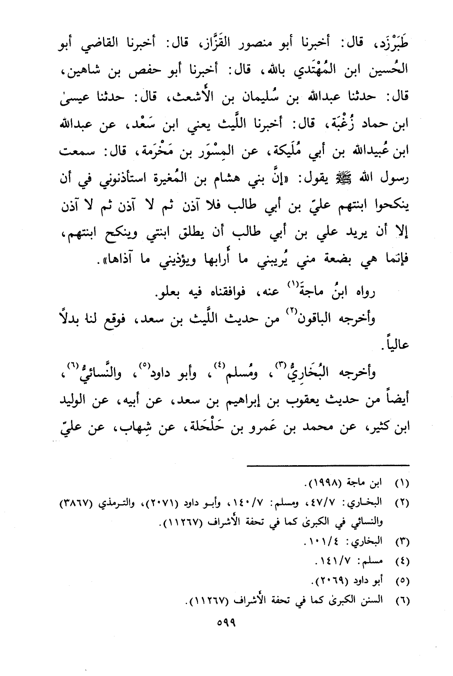 طبرزد، قال: أخبرنا أَبُو منصور الْقَزَّازُ، قال: أَخْبَرَنَا الْقَاضِي أَبُو الْحُسَيْنِ ابْنُ الْمُهَتِدِي بِاللَّهِ، قال: أَخْبَرَنَا أَبُو حَفْصِ بْنُ شَاهِينَ، قال: حَدَّثَنَا عَبد اللَّهِ بْن سُلَيْمان بْن الأشعث، قال: حَدَّثَنَا عيسى ابن حَمَّادٍ زَغْبَةُ، قال: أَخْبَرَنَا اللَّيْثُ يَعْنِي ابْنَ سَعْدٍ، عَنْ عَبد الله بن عُبَيد الله بن أَبي مُلَيْكَةَ، عَنِ الْمِسْوَرِ بْنِ مَخْرَمَةَ، قال: سَمِعْتُ رَسُولَ اللَّهِ صَلَّى اللَّهُ عَلَيْهِ وسَلَّمَ يقول: "إِنَّ بَنِي هِشَامِ بْنِ الْمُغِيرَةِ اسْتَأْذَنُونِي فِي أَنْ يَنْكِحُوا ابْنَتَهُمْ عَلِيَّ بْنَ أَبي طَالِبٍ فَلا آذن ثم لا آذَنُ ثُمَّ لا آذَنُ إِلا أَنْ يُرِيدَ عَلِيُّ بْنُ أَبي طَالِبٍ أَنْ يُطَلِّقَ ابْنَتِي ويَنْكِحَ ابْنَتَهُمْ، فَإِنَّمَا هِيَ بِضْعَةٌ مِنِّي يُرِيبُنِي مَا أَرَابَهَا ويُؤْذِينِي مَا آذَاهَا.
