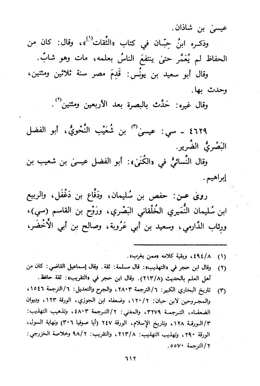 والمجروحين لابن حبان: 2 / 120، وضعفاء ابن الجوزي، الورقة 123، وديوان الضعفاء، الترجمة 3279، والمغني: 2 / الترجمة 4803، وتذهيب التهذيب: 3 / الورقة 128، وتاريخ الاسلام، الورقة 247 (أيا صوفيا 306) ونهاية السول، الورقة 290، وتهذيب التهذيب: 8 / 213، والتقريب: 2 / 98 وخلاصة الخزرجي: 2 / الترجمة 5570.
