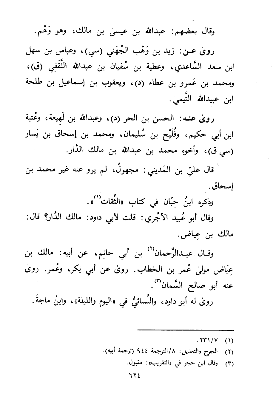 وَقَال عَبْد الرحمن (2) بْن أَبي حاتم، عَن أبيه: مالك بْن عياض مولى عُمَر بْن الخطاب. روى عَن أَبِي بكر، وعُمَر. روى عنه أَبُو صالح السمان (3) .