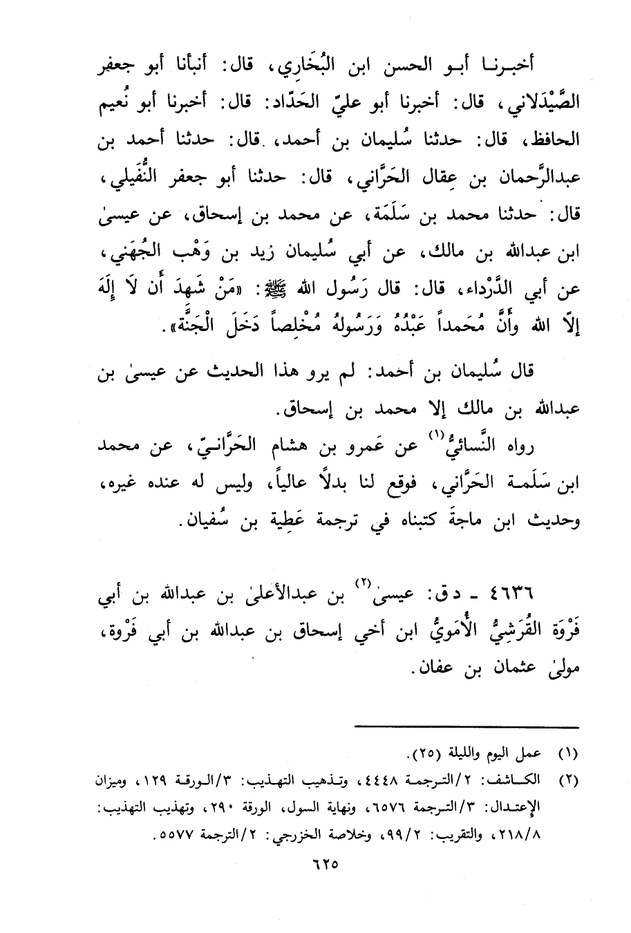 أَخْبَرَنَا أَبُو الْحَسَنِ بْنُ الْبُخَارِيِّ، قال: أَنْبَأَنَا أَبُو جَعْفَرٍ الصَّيْدَلانِيُّ، قال: أَخْبَرَنَا أَبُو عَلِيٍّ الحداد، قال: أَخْبَرَنَا أبو نعيم الْحَافِظُ، قال: حَدَّثَنَا سُلَيْمان بْنُ أَحْمَدَ، قال: حَدَّثَنَا أَحْمَدُ بْنُ عَبْدِ الرَّحْمَنِ بْنِ عِقَالٍ الْحَرَّانِيُّ، قال: حَدَّثَنَا أَبُو جَعْفَرٍ النُّفَيْلِيُّ، قال: حَدَّثَنَا مُحَمَّدُ بْنُ سَلَمَةَ، عَنْ مُحَمَّد بْن إسحاق، عَنْ عيسى ابن عَبد اللَّهِ بْنِ مَالِكٍ، عَن أَبِي سُلَيْمان زَيْدِ بْنِ وهْبٍ الْجُهَنِيِّ، عَن أَبِي الدَّرْدَاءِ، قال: قال رَسُولُ اللَّهِ صلى الله عَلَيْهِ وسَلَّمَ: "مَنْ شَهِدَ أَنْ لا إِلَهَ إِلا اللَّهُ وأَنَّ مُحَمَّدًا عَبْدُهُ ورَسُولُهُ مُخْلِصًا دَخَلَ الْجَنَّةَ.