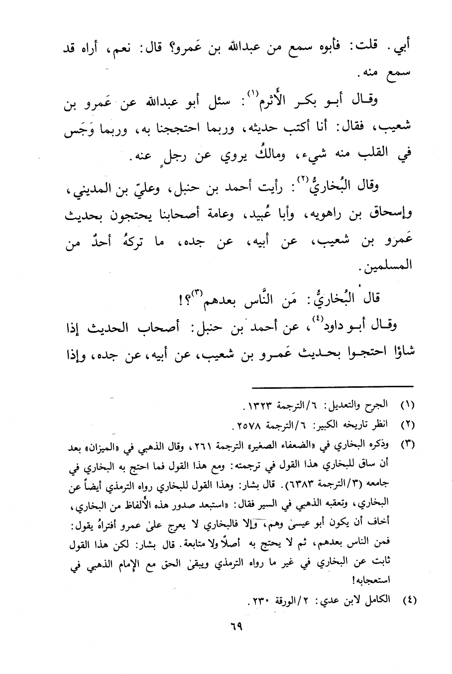 وقَال البُخارِيُّ (2) : رأيت أحمد بن حنبل، وعلي بن المديني، وإسحاق بن راهويه، وأبا عُبَيد، وعامة أصحابنا يحتجون بحديث عَمْرو بن شعيب، عَن أَبِيهِ، عَنْ جده، ما تركه أحد من المسلمين.