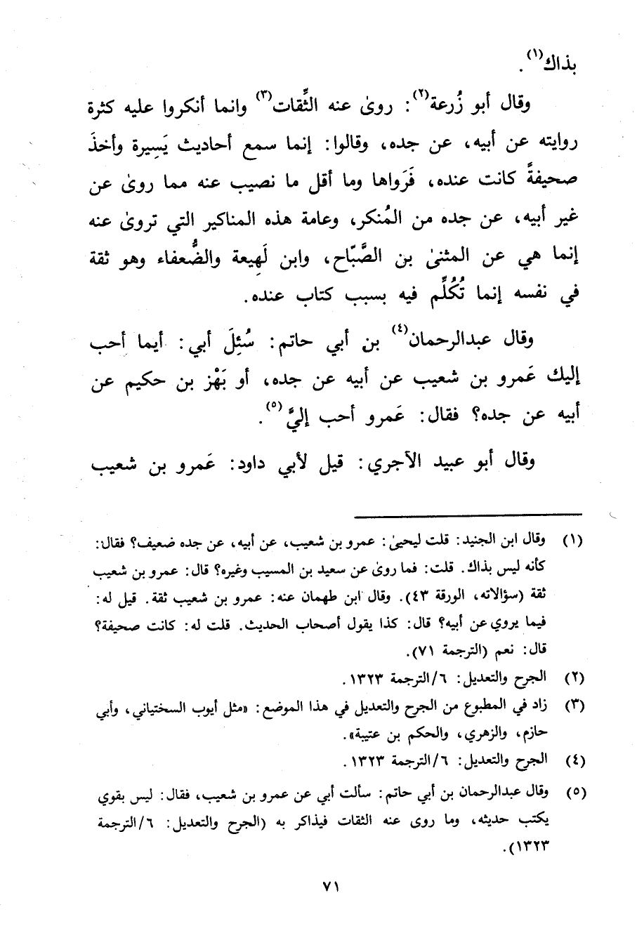 (5) وَقَال عبد الرحمن بن أَبي حاتم: سَأَلتُ أبي عن عَمْرو بن شعيب، فقال: ليس بقوي يكتب حديثه، وما روى عنه الثقات فيذاكر به (الجرح والتعديل: 6 / الترجمة 1323) .
