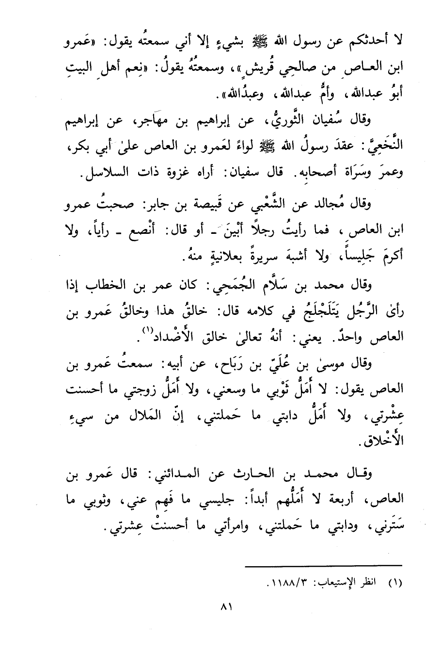 لا أحدثكم عن رسول الله صَلَّى اللَّهُ عَلَيْهِ وسَلَّمَ بشيءٍ إلا سمعته يقول: "عَمْرو ابن العاص من صالحي قريش "، وسمعته يقول: "نعم أهل البيت أبو عَبْد اللَّهِ، وأم عَبد اللَّهِ، وعبد الله.