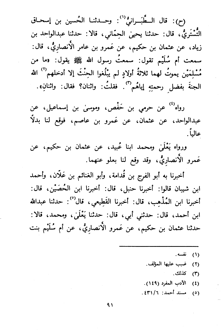 (ح) : قال الطَّبَرَانِيُّ (1) : وحَدَّثَنَا الْحُسَيْنُ بْنُ إِسْحَاقَ التُّسْتَرِيُّ، قال: حَدَّثَنَا يَحْيَى الْحَمَّانِيُّ، قَالا: حَدَّثَنَا عَبْدُ الْوَاحِدُ بْنُ زِيَادٍ، عَنْ عُثْمَانَ بْنِ حَكِيمٍ، عَنْ عَمْرو بْنِ عَامِرٍ الأَنْصارِيّ، قال: سَمِعْتُ أُمَّ سُلَيْمٍ تَقُولُ: سَمِعْتُ رَسُولَ اللَّهِ صَلَّى اللَّهُ عَلَيْهِ وسَلَّمَ يقول: "مَا مِنْ مُسْلِمَيْنِ يَمُوتُ لَهُمَا ثَلاثَةُ أَوْلادٍ لَمْ يَبْلُغُوا الْحِنْثَ إِلا أَدْخَلَهُمُ (2) اللَّهُ الْجَنَّةَ بِفَضْلِ رَحْمَتِهِ إِيَّاهُمْ (3) . فَقُلْتُ: واثْنَانِ؟ فَقَالَ: واثْنَانِ.