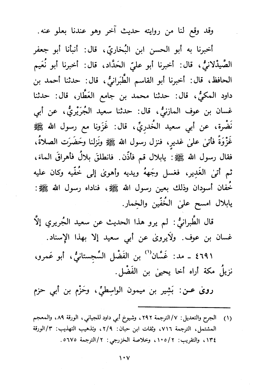 أَخْبَرَنَا بِهِ أَبُو الْحَسَنِ بْنِ الْبُخَارِيِّ، قال: أنبأنا أَبُو جَعْفَرٍ الصَّيْدَلانِيُّ، قال: أَخْبَرَنَا أَبُو عَلِيّ الحداد، قال: أَخْبَرَنَا أَبُو نُعَيْمٍ الْحَافِظُ، قال: أَخْبَرَنَا أَبُو الْقَاسِمِ الطَّبَرَانِيُّ، قال: حَدَّثَنَا أَحْمَدُ بْنُ دَاوُدَ الْمَكِّيُّ، قال: حَدَّثَنَا مُحَمَّدُ بْنُ جَامِعٍ الْعَطَّارُ، قال: حَدَّثَنَا غَسَّانُ بْنُ عَوْفٍ الْمَازِنِيُّ، قال: حَدَّثَنَا سَعِيد الْجُرَيْرِيُّ، عَن أبي نضرة، عَن أبي سَعِيد الخُدْرِيّ، قال: غَزَوْنَا مَعَ رَسُولِ اللَّهِ صلى الله عليه وسلم غَزْوَةً فَأَتَى عَلَى غَدِيرٍ، فَنَزَلَ رَسُول اللَّهِ صلى الله عليه وسَلَّمَ ونَزَلْنَا وحَضَرَتِ الصَّلاةُ، فَقَالَ رَسُول اللَّهِ صلى الله عليه وسَلَّمَ: يَا بِلالٌ قُمْ فَأَذِّنْ. فَانْطَلَقَ بِلالٌ فَأَهْرَاقَ الْمَاءَ، ثُمَّ أَتَى الْغَدِيرَ، فَغَسَلَ وجْهَهُ ويَدَيْهِ وأَهْوَى إِلَى خُفَّيْهِ وكَانَ عَلَيْهِ خُفَّانِ أَسْوَدَانِ وذَلِكَ بِعَيْنِ رَسُولِ اللَّهِ صلى الله عليه وسلم، فَنَادَاهُ رَسُولُ اللَّهِ صَلَّى اللَّهُ عَلَيْهِ وسَلَّمَ: يَا بِلالٌ امْسَحْ عَلَى الْخُفَّيْنِ والْخِمَارِ.