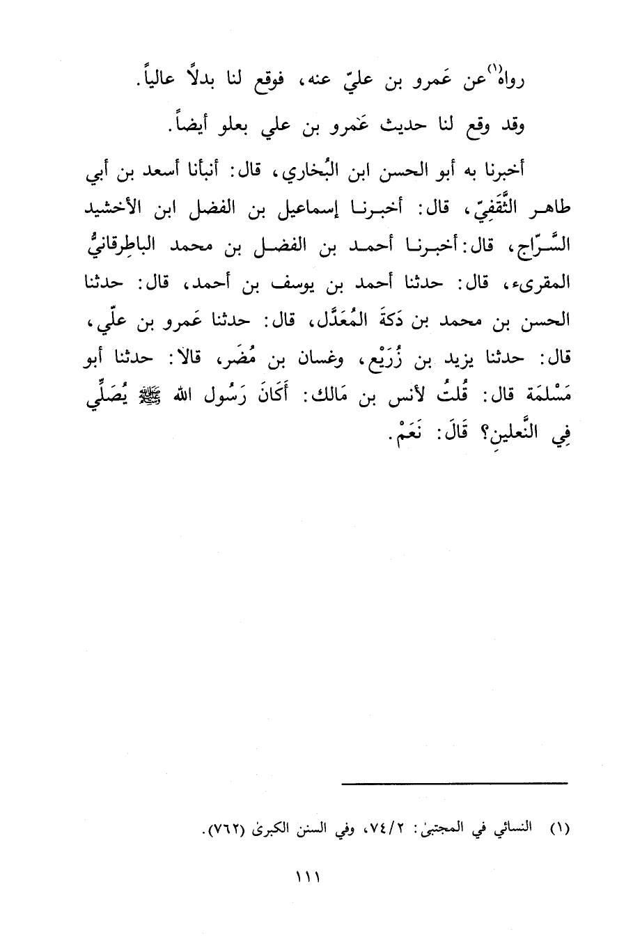 أَخْبَرَنَا بِهِ أَبُو الْحَسَنِ بْنُ الْبُخَارِيِّ، قال: أَنْبَأَنَا أَسْعَدُ بْنُ أَبي طَاهِرٍ الثَّقَفِيُّ، قال: أخبرنا إِسْمَاعِيلُ بن الفضل ابن الإِخْشِيدِ السَّرَّاجُ، قال: أَخْبَرَنَا أَحْمَدُ بْنُ الْفَضْلِ بْنِ مُحَمَّدٍ الْبَاطِرْقَانِيُّ المقرئ، قال: حَدَّثَنَا أَحْمَد بْن يُوسُفُ بْنُ أَحْمَدَ، قال: حَدَّثَنَا الْحَسَن بْن مُحَمَّدِ بْن دكة الْمُعَدِّلُ، قال: حَدَّثَنَا عَمْرو بْنُ عَلِيٍّ، قال: حَدَّثَنَا يَزِيدُ بْنُ زُرَيْعٍ، وغَسَّانُ بْنُ مُضَرٍ، قَالا: حَدَّثَنَا أَبُو مَسْلَمَةَ قال: قُلْتُ لأنس بْن مالك: أكان رَسُول اللَّهِ صلى الله عليه وسلم يُصَلِّي فِي النَّعْلَيْنِ؟ قال: نَعَمْ.