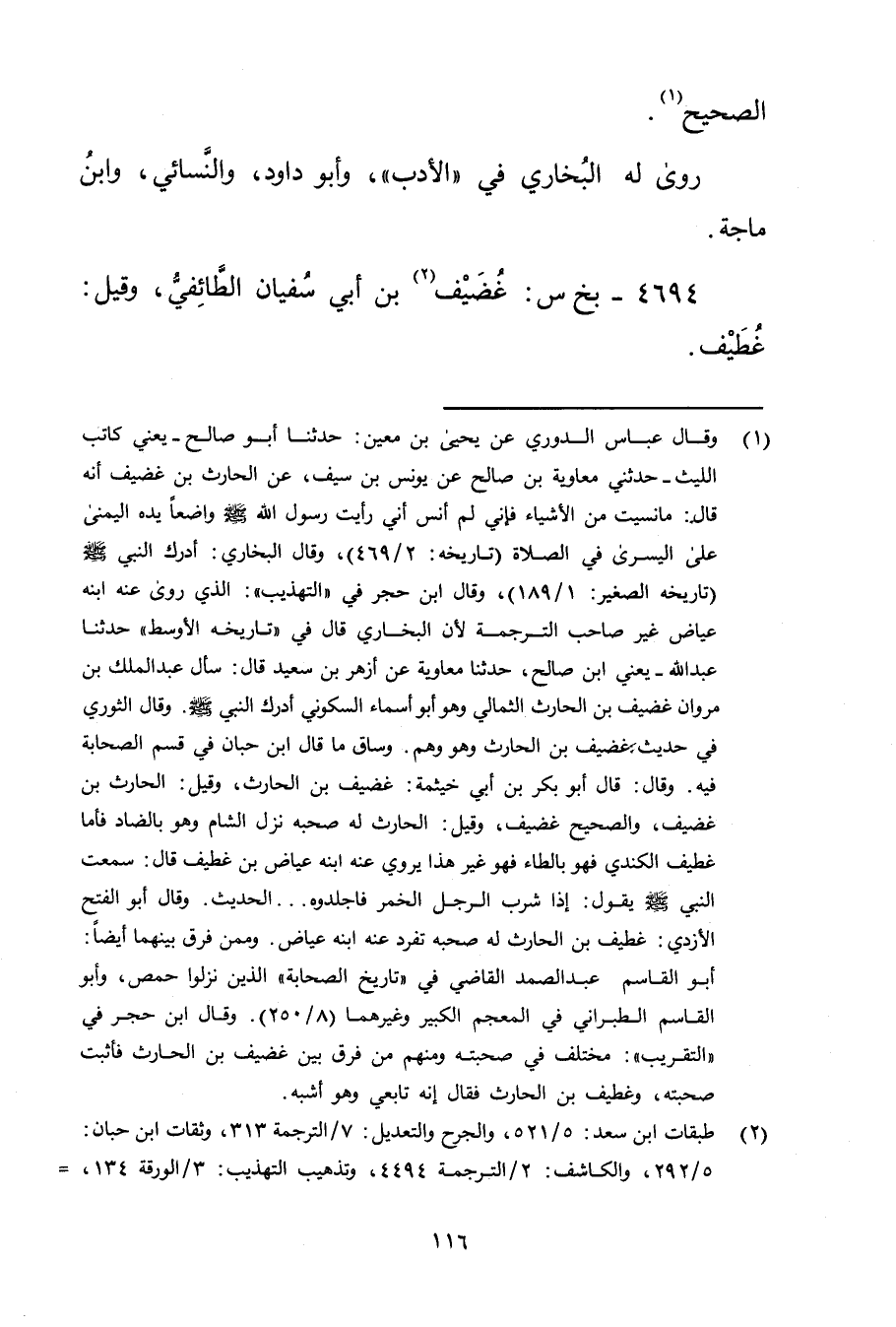 (1) وَقَال عَباس الدُّورِيُّ عَن يحيى بن مَعِين: حَدَّثَنَا أبو صالح، يعني كاتب الليث - حَدَّثَنِي مُعَاوِيَةُ بْنُ صَالِحٍ عَنْ يونس بن سيف، عن الحارث بن غضيف أنه قال: ما نسبت من الاشياء فإني لم أنس اني رأيت رسول الله صلى الله عليه وسلم واضعا يده اليمنى على اليسرى في الصلاة (تاريخه: 2 / 469) ، وقَال البُخارِيُّ: أدرك النبي صلى الله عليه وسلم (تاريخه الصغير: 1 / 189) ، وَقَال ابن حجر في (التهذيب) : الذي روى عنه ابنه عياض غير صاحب الترجمة لان البخاري قال في (تاريخه الاوسط) حَدَّثَنَا عَبد الله، يعني ابن صالح، حَدَّثَنَا معاوية عن أزهر بن سَعِيد قال: سأل عَبد المَلِك بن مروان غضيف بن الحارث الثمالي وهو أبو أسماء السكوني أدرك النبي صلى الله عليه وسلم. وَقَال الثوري في حديث: غضيف بن الحارث وهو وهم. وساق ما قال ابن حبان في قسم الصحابة فيه. وَقَال: قال أبو بكر بن أَبي خيثمة: غضيف بن الحارث، وقيل: الحارث بن غضيف، والصحيح غضيف، وقيل: الحارث له صحبه نزل الشام وهو بالضاد فأما غطيف الكندي فهو بالطاء فهو غير هذا يروي عنه ابنه عياض بن غطيف قال: سمعت النبي صلى الله عليه وسلم يقول: إذا شرب الرجل الخمر فاجلدوه ... الحديث. وَقَال أبو الفتح الأزدي: غطيف بن الحارث له صحبه تفرد عنه ابنه عياض. وممن فرق بينهما أيضا: أبو القاسم عبد الصمد القاضي في (تاريخ الصحابة) الذين نزلوا حمص، وأبو القاسم الطبراني في المعجم الكبير وغيرهما (8 / 250) . وَقَال ابن حجر في (التقريب) : مختلف في صحبته ومنهم من فرق بين غضيف بن الحارث فأثبت صحبته، وغطيف بن الحارث فقال إنه تابعي وهو أشبه.
