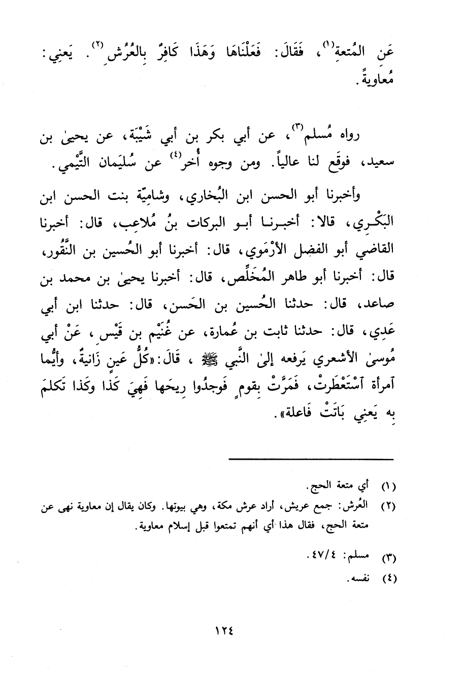 (2) العرش: جمع عريش، أراد عرش مكة، وهي بيوتها. وكان يقال إن معاوية نهى عن متعة الحج، فقال هذا أي أنهم تمتعوا قبل إسلام معاوية.