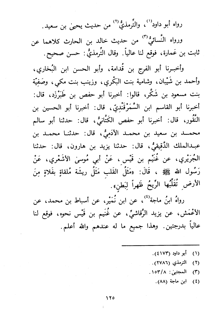 وأَخْبَرَنَا أَبُو الفرج بْن قدامة، وأبو الْحَسَن بْن البخاري، وأحمد بْن شيبان، وشَامِيَّةُ بِنْتُ الْبَكْرِيِّ، وزَيْنَبُ بِنْتُ مَكِّيٍّ، وصَفِيَّةُ بِنْتُ مَسْعُودِ بْنِ شُكْرٍ، قَالُوا: أخبرنا أَبُو حَفْصِ بن طَبَرْزَذَ، قال: أَخْبَرَنَا أَبُو الْقَاسِمِ ابْنُ السمرقندي، قال: أَخْبَرَنَا أبو الحسين بْن النقور، قال: أَخْبَرَنَا أبو حَفْصٍ الْكَتَّانِيُّ، قال: حَدَّثَنَا أَبُو سَالِمٍ مُحَمَّدُ بْنُ سَعِيد بْنِ محمد الأدمي، قال: حَدَّثَنَا محمد بْن عَبد المَلِك الدقيقي، قال: حَدَّثَنَا يزيد بْن هارون، قال: حَدَّثَنَا الْجَرِيرِيُّ، عَنْ غُنَيْمِ بْنِ قَيْسٍ، عَن أَبِي مُوسَى الأَشْعَرِيِّ، عن رَسُولِ اللَّهِ صَلَّى اللَّهُ عَلَيْهِ وسَلَّمَ، قال: (مَثَلُ الْقَلْبِ مَثَلُ رِيشَةٍ مُلْقَاةٍ بِفَلاةٍ مِنَ الأَرْضِ تُقَلِّبُهَا الرِّيحُ ظَهْرًا لِبَطْنٍ) .