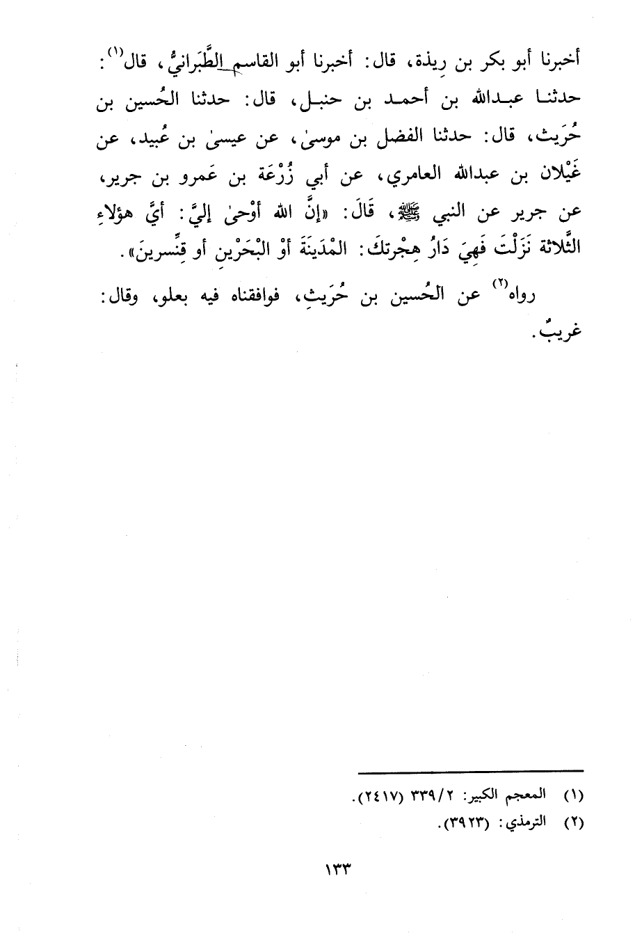 أخبرنا أَبُو بَكْرِ بْنُ رِيذَةَ، قال: أخبرنا أَبُو الْقَاسِمِ الطَّبَرَانِيُّ، قال (1) : حَدَّثَنَا عَبد اللَّهِ بْن أَحْمَد بْن حنبل، قال: حَدَّثَنَا الْحُسَيْنُ بْنُ حُريْثٍ قال: حَدَّثَنَا الْفَضْلُ بْنُ مُوسَى، عَنْ عِيسَى بْنِ عُبَيد، عَنْ غَيْلانَ بْنِ عَبد اللَّهِ الْعَامِرِيِّ، عَن أَبِي زرعة بْن عَمْرو بْن جرير، عَنْ جَرِيرٍ عَنِ النَّبِيِّ صَلَّى اللَّهُ عَلَيْهِ وسَلَّمَ، قال: (إن اللَّهَ أَوْحَى إِلَيَّ: أَيَّ هَؤُلاءِ الثَّلاثَةِ نَزَلْتَ فَهِيَ دَارُ هِجْرَتِكَ: الْمَدِينَةَ أَوِ الْبَحْرِينِ أَوْ قِنِّسَرِينَ) .