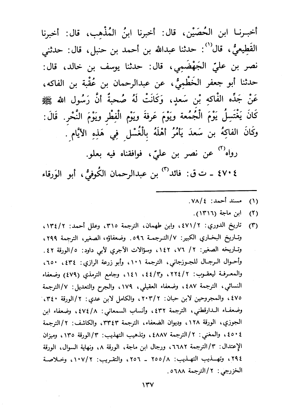 أخبرنا ابن الحصين، قال: أخبرنا ابْنُ الْمُذْهِب، قال: أخبرنا القَطِيعِيّ، قال (1) : حَدَّثَنَا عَبد اللَّهِ بْن أحمد بْن حنبل، قال: حدثني نصر بن علي الجهضمي، قال: حَدَّثَنَا يُوسُفُ بْنُ خَالِدٍ، قال: حَدَّثَنَا أَبُو جَعْفَرٍ الْخَطَمِيُّ، عَنْ عَبْد الرَّحْمَن بن عقبة بن الْفَاكِهِ، عَنْ جَدِّهِ الْفَاكِهِ بْنِ سَعْدٍ، وكَانَتْ لهُ صُحبَةٌ أَنَّ رَسُول اللَّهِ صلى الله عليه وسَلَّمَ كَانَ يَغْتَسِلُ يَوْمَ الْجُمُعَةِ ويَوْمَ عَرَفَةَ ويَوْمَ الْفَطْرِ ويَوْمَ النَّحْرِ. قال: وكَانَ الْفَاكِهُ بْنُ سَعْدٍ يَأْمُرُ أَهْلَهُ بِالْغُسْلِ فِي هَذِهِ الأَيَّامِ.