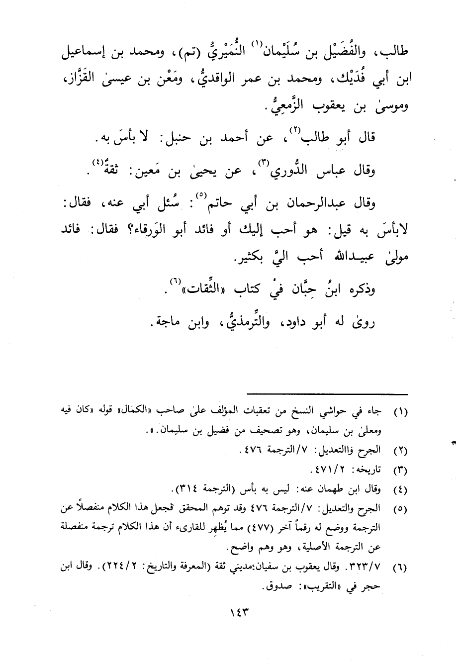 (5) الجرح والتعديل: 7 / الترجمة 476 وقد توهم المحقق فجعل هذا الكلام منفصلا عن الترجمة ووضع له رقما آخر (477) مما يظهر للقارئ أن هذا الكلام ترجمة منفصلة عن الترجمة الاصلية، وهو وهم واضح.