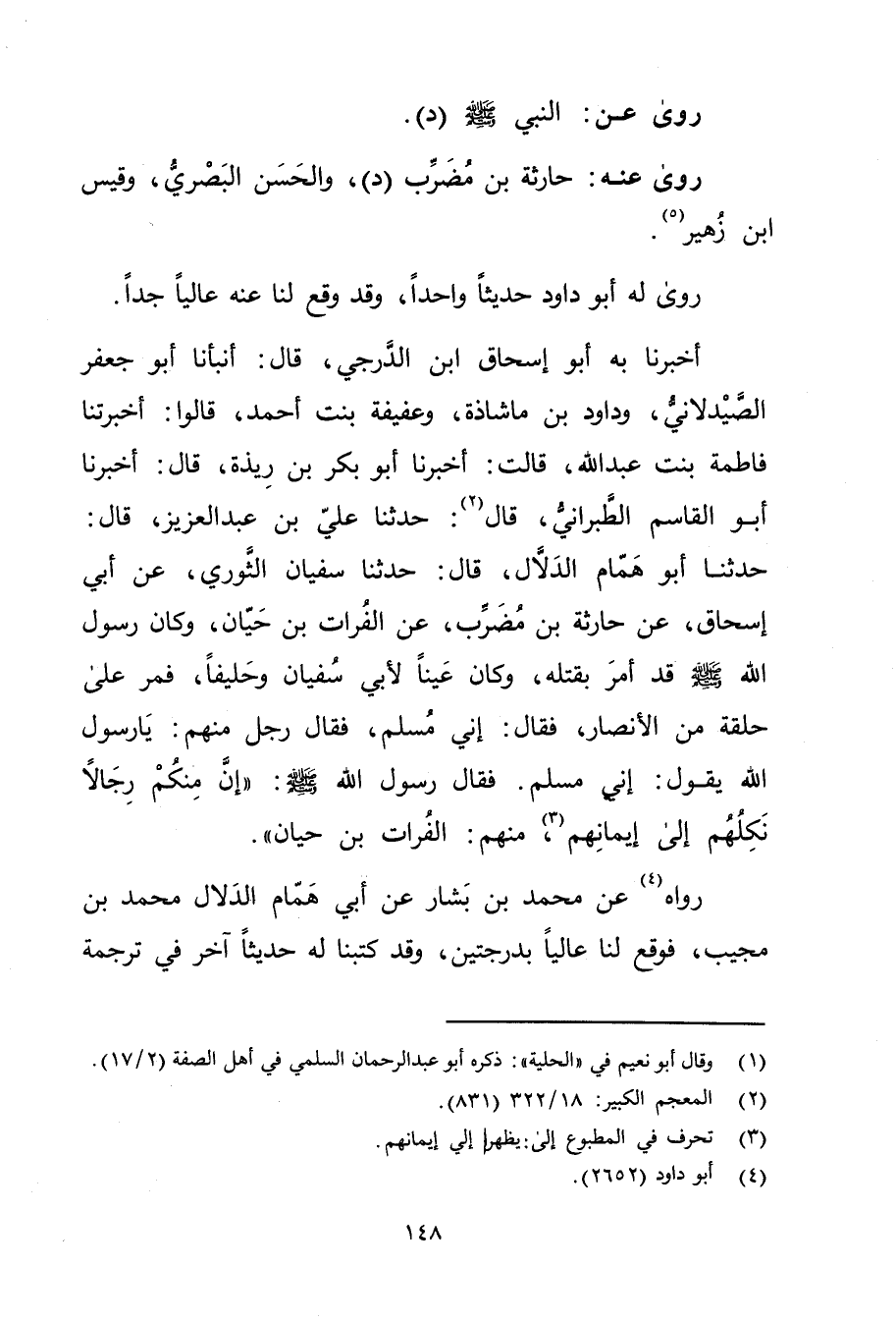 أَخْبَرَنَا بِهِ أَبُو إِسْحَاق بْن الدرجي، قال: أَنْبَأَنَا أَبُو جعفر الصيدلاني، وداود بْن ماشاذة، وعفيفة بْنت أحمد، قَالُوا: أَخْبَرَتْنا فَاطِمَةُ بِنْتُ عَبد اللَّهِ، قَالَتْ: أخبرنا أَبُو بَكْرِ بْنِ رِيذَةَ، قال: أخبرنا أَبُو القاسم الطَّبَرَانِيّ، قال (2) : حَدَّثَنَا علي بْنُ عَبْدِ الْعَزِيزِ، قال: حَدَّثَنَا أَبُو هَمَّامٍ الدَّلالُ، قال: حَدَّثَنَا سُفْيَانُ الثَّوْرِيُّ، عَن أَبِي إِسْحَاقَ، عن حارثة بْن مضرب، عن الْفُرَاتِ بْنِ حَيَّانَ، وكَانَ رَسُولُ اللَّهِ صلى الله عليه وسلم قَدْ أَمَرَ بِقَتْلِهِ، وكَانَ عَيْنًا لأَبِي سُفْيَانَ وحَلِيفًا، فَمَرَّ عَلَى حَلْقَةٍ مِنَ الأَنْصَارِ، فَقَالَ: إِنِّي مُسْلِمٌ، فَقَالَ رَجُلٌ مِنْهُمْ: يَا رَسُولَ اللَّهِ يَقُولُ: إِنِّي مُسْلِمٌ. فَقَالَ رَسُولُ اللَّهِ صلى الله عليه وسلم: (إن منكم رجالا نَكِلُهُمْ إِلَى إِيمَانِهِمْ (3) ، مِنْهُمُ: الْفُرَاتُ بْنُ حَيَّانَ) .