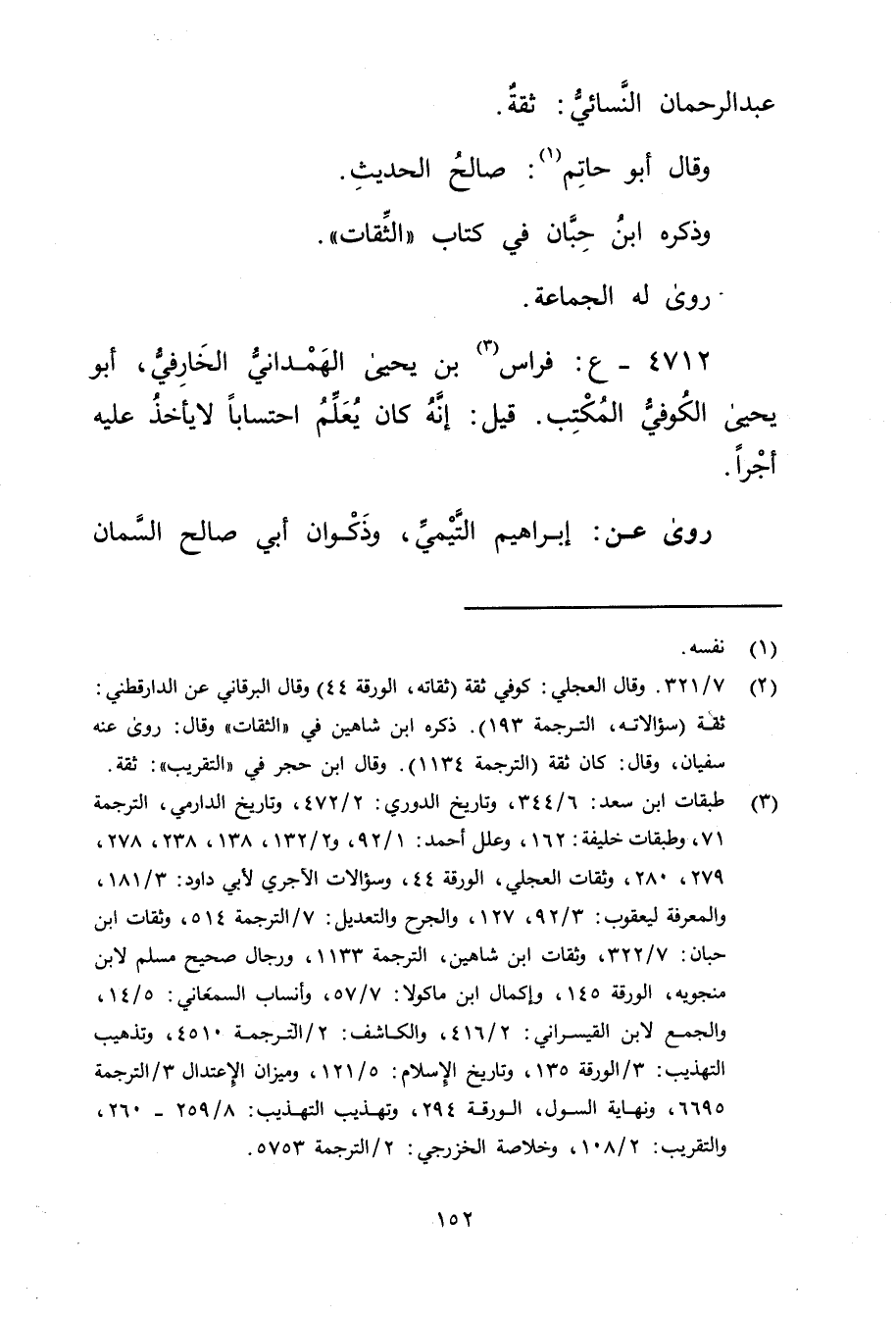4712 - ع: فراس بن يَحْيَى الهمداني الخارفي (3) ، أَبُو يَحْيَى الكوفي المكتب. قيل: إنه كان يعلم احتسابا لا يأخذ عليه أجرا.