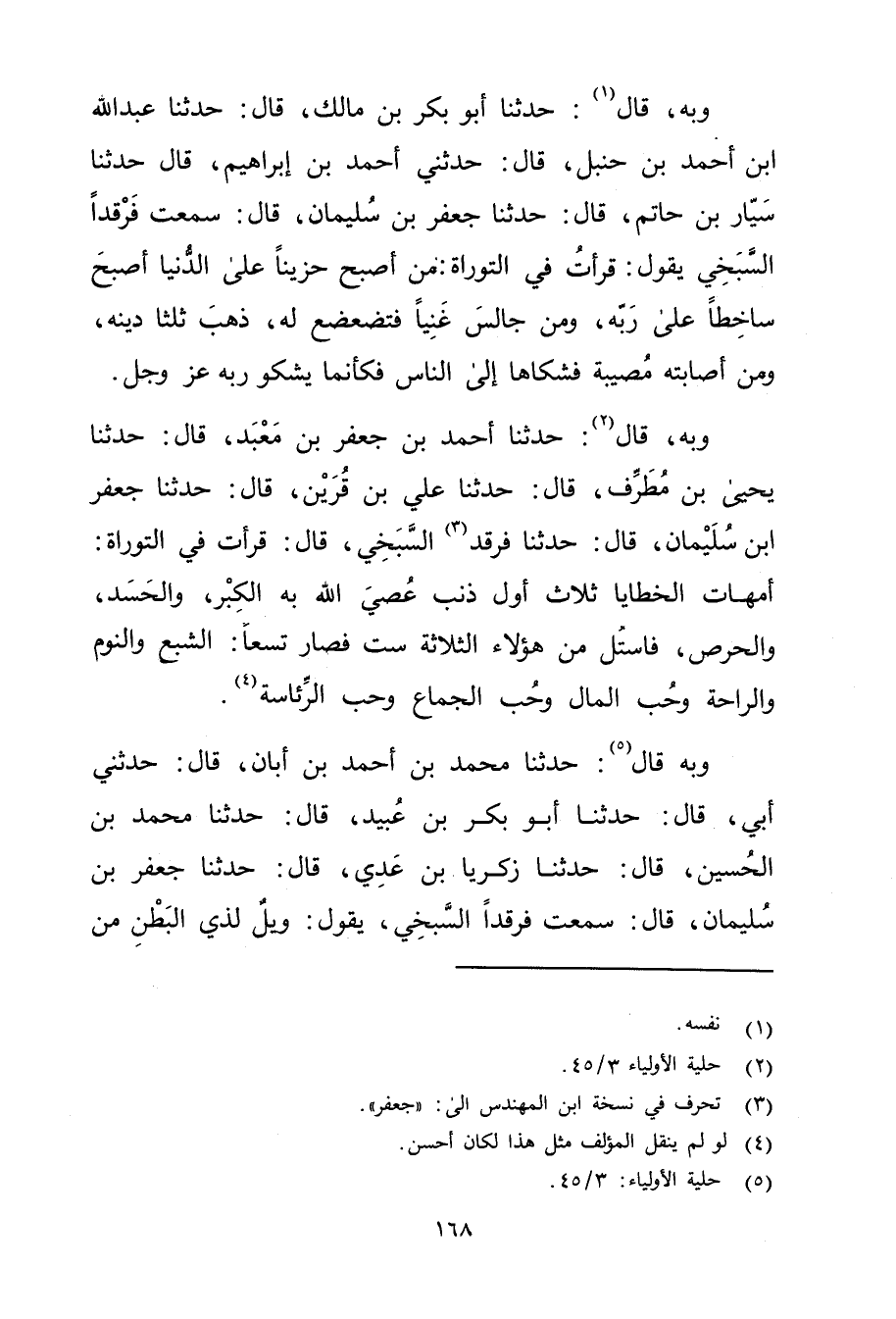 وبه قال (2) : حَدَّثَنَا أَحْمَدُ بْنُ جَعْفَر بْن معبد، قال: حَدَّثَنَا يَحْيَى بْن مطرف، قال: حَدَّثَنَا عَلِيّ بْن قرين، قال: حَدَّثَنَا جَعْفَرُ بْنُ سُلَيْمان، قال: حَدَّثَنَا فرقد (3) السبخي، قال: قرأت في التوراة: أمهات الخطايا ثلاث أول ذنب عصي الله بِهِ الكبر، والحسد، والحرص، فاستل من هؤلاء الثلاثة ست فصار تسعا: الشبع والنوم والراحة وحب المال وحب الجماع وحب الرئاسة (4) .