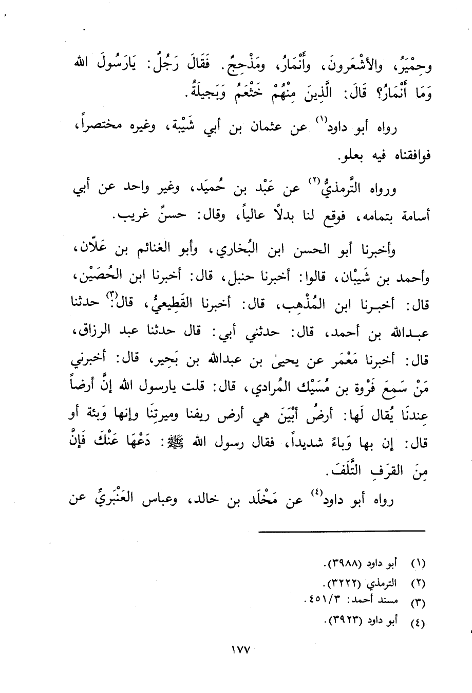 وأَخْبَرَنَا أَبُو الْحَسَنُ بْنُ الْبُخَارِيِّ، وأَبُو الْغَنَائِمِ بْن علان، وأحمد بْن شيبان، قَالُوا: أخبرنا حنبل، قال: أخبرنا ابْنُ الْحُصَيْنِ، قال: أخبرنا ابْنُ الْمُذْهِب، قال: أخبرنا القَطِيعِيّ، قال (3) : حَدَّثَنَا عَبد اللَّهِ بْنُ أَحْمَدَ، قال: حَدَّثني أبي: قال حَدَّثَنَا عَبْدُ الرَّزَّاقِ، قال: أَخْبَرَنَا مَعْمَرٌ عن يَحْيَى بْنِ عَبد اللَّهِ بْنِ بُحَيْرٍ، قال: أَخْبَرَنِي مَنْ سَمِعَ فَرْوَةَ بْنَ مُسَيْكٍ الْمُرَادِيَّ، قال: قُلْتُ يَا رَسُولَ اللَّهِ إن أرضا عندنا يقال هلا: أَرْضُ أَبْيَنَ هِيَ أَرْضُ رِيفِنَا ومِيرَتِنَا وإِنَّهَا وبِئَةٌ أَوْ قال: إِنَّ بِهَا وبَاءً شَدِيدًا، فَقَالَ رَسُول اللَّهِ صلى الله عليه وسَلَّمَ: دَعْهَا عَنْكَ فَإِنَّ مِنَ الْقَرَفِ التَّلَفَ.