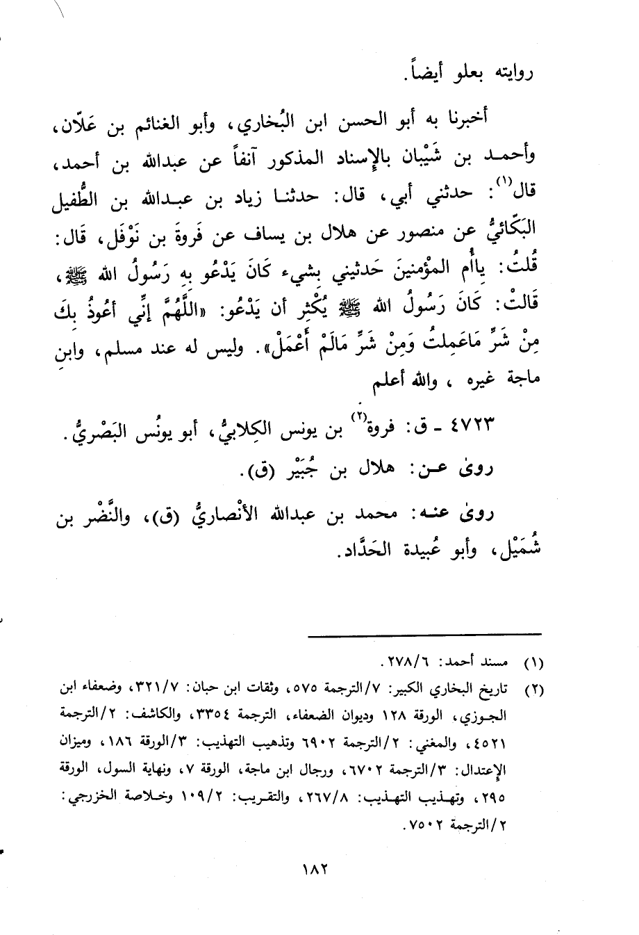 أَخْبَرَنَا بِهِ أَبُو الحسن بْن البخاري، وأبو الغنائم بْن علان، وأحمد بْن شَيْبَانَ بِالإِسْنَادِ الْمَذْكُورِ آنِفًا عَنْ عَبد اللَّهِ بْن أَحْمَدَ، قال (1) : حَدَّثني أَبِي، قال: حَدَّثَنَا زِيَادُ بن عَبد الله بن الطفيل الْبَكَّائِيُّ عَنْ مَنْصُورٍ عَنْ هِلالِ بْنِ يَِسَاف عَنْ فَرْوَةَ بْنِ نَوْفَلٍ، قال: قُلْتُ: يَا أُمَّ الْمُؤْمِنِينَ حَدِّثِينِي بشيءٍ كَانَ يَدْعُو بِهِ رَسُولُ اللَّهِ صلى الله عَلَيْهِ وسَلَّمَ، قَالَتْ: كَانَ رَسُولُ اللَّهِ صلى الله عليه وسلم يُكْثِرُ أَنْ يَدْعُوَ: (اللَّهُمَّ إِنِّي أَعُوذُ بِكَ مِنْ شَرِّ مَا عَمِلْتُ ومِنْ شَرِّ مَا لَمْ أَعْمَلْ) . ولْيَس لَهُ عِنْدَ مُسْلِمٍ، وابن ماجه غيره، والله أعلم.