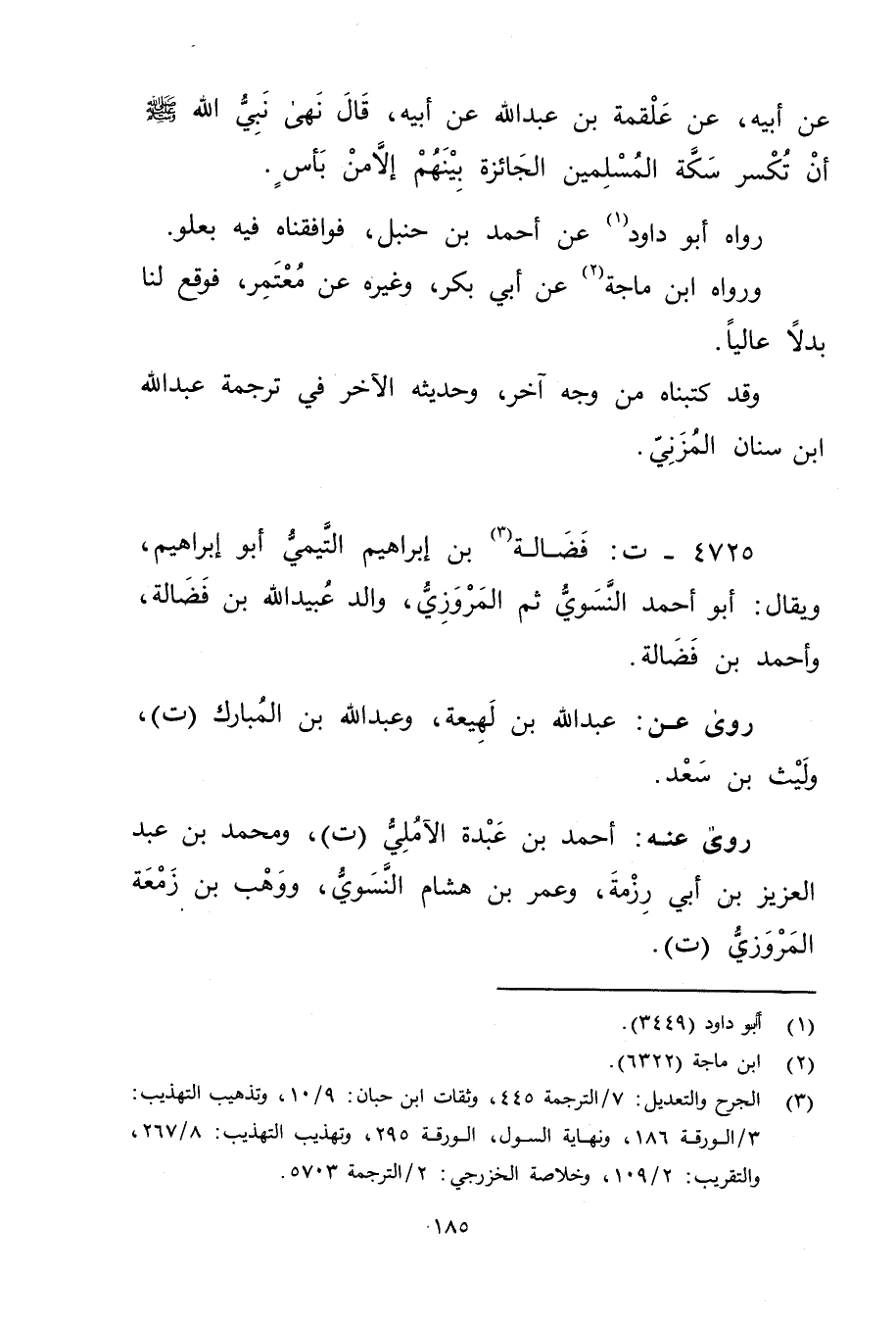 4725 - ت: فضالة بن إِبْرَاهِيم التَّيْمِيّ أَبُو إِبْرَاهِيم (3) ، ويُقال: أَبُو أَحْمَد النسوي ثم المروزي، والد عُبَيد الله بْن فضالة وأحمد بْن فضالة.