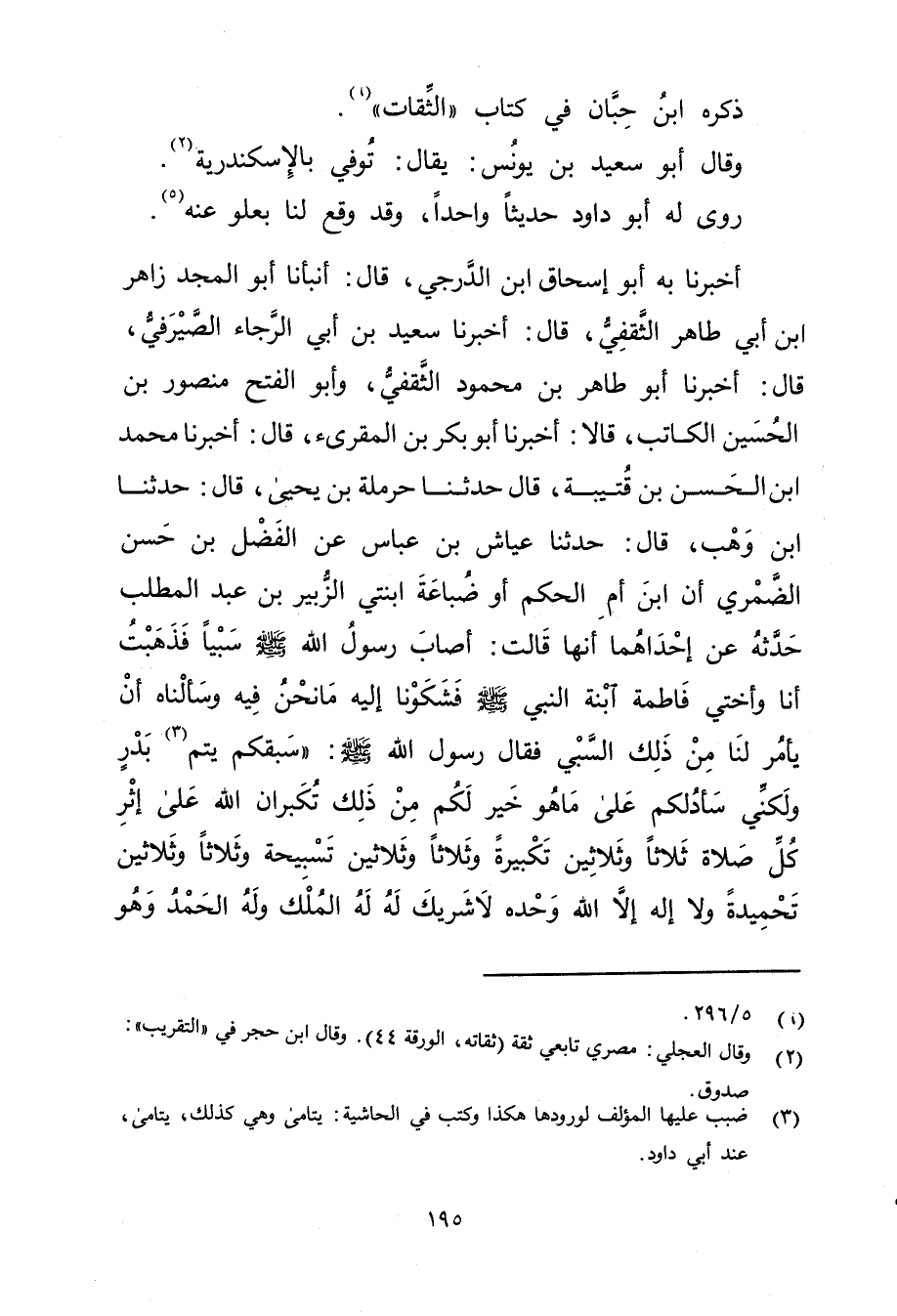 أَخْبَرَنَا بِهِ أَبُو إِسْحَاقَ ابْنُ الدَّرَجِيِّ، قال: أَنْبَأَنَا أبو المجد زاهر ابن أَبي طَاهِرٍ الثَّقَفِيُّ، قال: أخبرنا سَعِيد بْنُ أَبي الرَّجَاءِ الصَّيْرَفِيُّ، قال: أَخْبَرَنَا أَبُو طَاهِرِ بْنُ مَحْمُودٍ الثَّقَفِيُّ، وأَبُو الْفَتْحِ مَنْصُورُ بْنُ الْحُسَيْنِ الْكَاتِبُ، قَالا: أَخْبَرَنَا أَبُو بَكْرِ بْنُ الْمُقْرِئِ، قال: أخبرنا محمد ابن الْحَسَنِ بْنِ قُتَيْبَةَ، قال حَدَّثَنَا حَرْمَلَةُ بْنُ يَحْيَى، قال: حَدَّثَنَا ابْنُ وهْبٍ، قال: حَدَّثَنَا عَيَّاشُ بْنِ عَبَّاسٍ عَنِ الْفَضْلِ بْنِ حَسَنٍ الضَّمْرِيِّ أَنَّ ابْنَ أُمِّ الْحَكَمِ أَوْ ضُبَاعَةَ ابْنَتَيِ الزُّبَيْرِ بن عبد المطلب حَدَّثَهُ عَنْ إِحْدِاهِمَا أَنَّهَا قَالَتْ: أَصَابَ رَسُولُ اللَّهِ صَلَّى اللَّهُ عَلَيْهِ وسَلَّمَ سَبْيًا فَذَهَبْتُ أَنَا وأُخْتِي فَاطِمَةُ ابْنَةُ النَّبِيِّ صَلَّى اللَّهُ عَلَيْهِ وسَلَّمَ فشكونا إليه مَا نَحْنُ فِيهِ وسَأَلْنَاهُ أَنْ يَأْمُرَ لَنَا مِنْ ذَلِكَ السَّبْيِ فَقَالَ رَسُولُ اللَّهِ صلى الله عَلَيْهِ وسَلَّمَ: (سَبَقَكُمْ يُتْمُ (3) بَدْرٍ ولَكِنِّي سَأَدُلُكُمْ عَلَى مَا هُوَ خَيْرٌ لَكُمْ مِنْ ذَلِكَ تُكَبِّرَانِ اللَّهَ عَلَى إِثْرِ كُلِّ صَلاةٍ ثَلاثًا وثَلاثِينَ تَكْبِيرَةً وثَلاثًا وثَلاثِينَ تَسْبِيحَةً وثَلاثًا وثَلاثِينَ تَحْمِيدَةً ولا إله إلا اللَّه وحده لا شَرِيك لَهُ لَهُ الْمُلْكُ ولَهُ الحمد وهو
