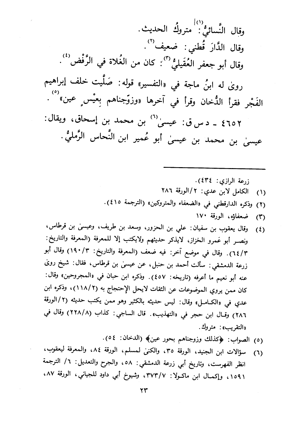 (6) سؤالات ابن الجنيد، الورقة 35، والكنى لمسلم، الورقة 84، والمعرفة ليعقوب، انظر الفهرست، وتاريخ أبي زرعة الدمشقي: 58، والجرح والتعديل: 6 الترجمة 1591، وإكمال ابن ماكولا: 7 / 373، وشيوخ أبي داود للجياني، الورقة 87، والمعجم المشتمل، الترجمة 713، وسير أعلام النبلاء: 12 / 52، والكاشف: 2 / الترجمة 4461، وتذهيب التهذيب: 3 / الورقة 131، وتاريخ الاسلام، الورقة 256 (أحمد الثالث (2917 / 7) ونهاية السول، الورقة 291، وتهذيب التهذيب: 8 / 228 - 229، والتقريب: 2 / 101، وخلاصة الخزرجي: 2 / الترجمة 5594.