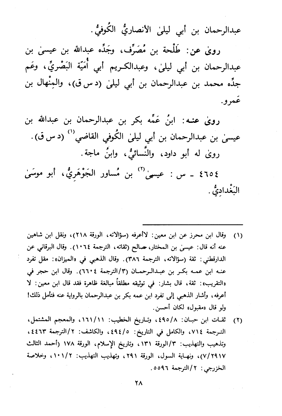 (1) وَقَال ابن محرز عن ابن مَعِين: لا أعرفه (سؤالاته، الورقة 218) ، ونقل ابن شاهين عنه أنه قال: عيسى بن المختار، صالح (ثقاته، الترجمة 1064) . وَقَال البرقاني عن الدَّارَقُطنِيّ: ثقة (سؤالاته، الترجمة 386) . وَقَال الذهبي في (الميزان) مقل تفرد عنه ابْن عمه بَكْر بْن عبد الرحمن (3 / الترجمة 6604) . وَقَال ابن حجر في (التقريب) : ثقة، قال بشار: في توثيقه مطلقا مبالغة ظاهرة فقد قال ابن مَعِين: لا أعرفه، وأشار الذهبي إلى تفرد ابن عمه بكر بن عبد الرحمن بالرواية عنه فتأمل ذلك! ولو قال (مقبول) لكان أحسن.