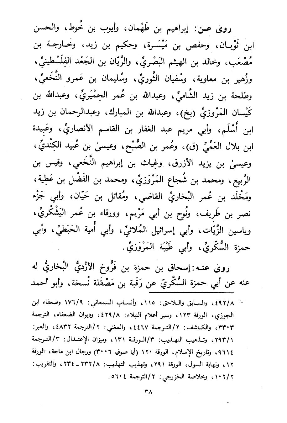 = 8 / 49 2، والسابق واللاحق: 115، وأنساب السمعاني: 9 / 176 وضعفاء ابن الجوزي، الورقة 123، وسير أعلام النبلاء: 8 / 429، وديوان الضعفاء، الترجمة 3303، والكاشف: 2 / الترجمة 4467، والمغني: 2 / الترجمة 4832، والعبر: 1 / 293، وتذهيب التهذيب: 3 / الورقة 131، وميزان الاعتدال: 3 / الترجمة 9614، وتاريخ الاسلام، الورقة 120 (أياصوفيا 3006) ورجال ابن ماجة، الورقة 12، ونهاية السول، الورقة 291، وتهذيب التهذيب: 8 / 232 - 234، والتقريب: 2 / 102، وخلاصة الخزرجي: 2 / الترجمة 5604.