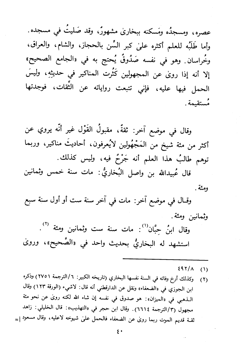 (1) 8 / 492 (2) وكذلك أرخ وفاته في السنة نفسها البخاري (تاريخه الكبير: 6 / الترجمة 2751) وذكره ابن الجوزي في (الضعفاء) ونقل عن الدَّارَقُطنِيّ أنه قال: لا شيء (الورقة 123) وَقَال الذهبي في (الميزان) : هو صدوق في نفسه إن شاء الله لكنه روى عن نحو مئة مجهول (3 / الترجمة 6614) . وَقَال ابن حجر في (التهذيب) : قال الخليلي: زاهد ثقة قديم الموت ربما روى عن الضعفاء فالحمل على شيوخه لا عليه، وَقَال مسعود عن الحاكم: هو ثقة ولم يؤخذ عليه إلا كثرة روايته عن الكذابين. وَقَال البيهقي: فيه ضعف.