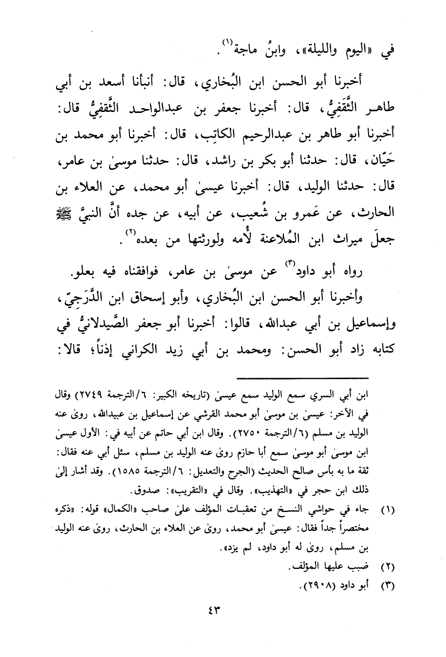 أَخْبَرَنَا أَبُو الْحَسَنِ بْنُ الْبُخَارِيِّ، قال: أَنْبَأَنَا أَسْعَدُ بْنُ أَبي طَاهِرٍ الثَّقَفِيُّ، قال: أَخْبَرَنَا جَعْفَرُ بْنُ عَبْدِ الْوَاحِدِ الثَّقَفِيُّ قال: أَخْبَرَنَا أَبُو طَاهِرِ بْنُ عَبد الرَّحِيمِ الْكَاتِبُ، قال: أَخْبَرَنَا أَبُو مُحَمَّد بْن حيان، قال: حَدَّثَنَا أَبُو بَكْرِ بْنُ رَاشِدٍ، قال: حَدَّثَنَا مُوسَى بْنُ عَامِرٍ، قال: حَدَّثَنَا الْوَلِيدُ، قال: أَخْبَرَنَا عِيسَى أَبُو مُحَمَّدٍ، عَنِ الْعَلاءِ بْنِ الحارث، عَنْ عَمْرو بْن شعيب، عَن أَبِيهِ، عَنْ جده أن النَّبِيُّ صلى الله عليه وسلم جَعَلَ مِيرَاثَ ابْنِ الْمُلاعِنَةِ لأُمِّهِ ولِوَرَثَتِهَا مِنْ بَعْدِهِ (2) .