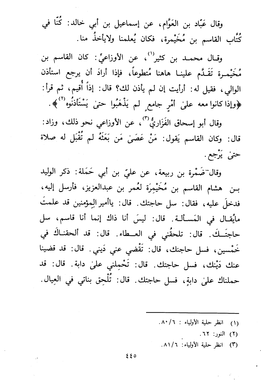 وَقَال مُحَمَّد بْن كثير (1) ، عَنِ الأَوزاعِيّ: كان القاسم بْن مخيمرة تقدم علينا هاهنا متطوعا، فإذا أراد أن يرجع استأذن الوالي، فقيل له: أرأيت إن لم يأذن لك؟ قال: إذا أقيم، ثم قرأ: {وإذا كانوا معه على أمر جامع لم يذهبوا حتى يستأذنوه (2} .