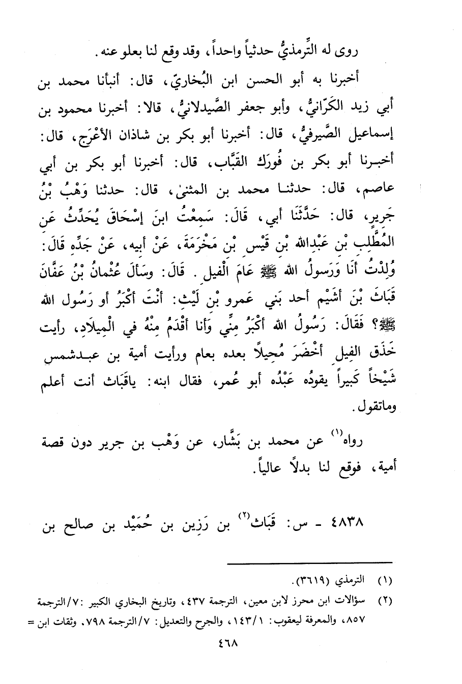أَخْبَرَنَا بِهِ أَبُو الْحَسَنِ بْنُ الْبُخَارِيِّ، قال: أَنْبَأَنَا مُحَمَّدُ بْنُ أَبي زَيْدٍ الْكَرَّانِيُّ، وأَبُو جَعْفَرٍ الصَّيْدَلانِيُّ، قَالا: أخبرنا مَحْمُودُ بْنُ إِسْمَاعِيلَ الصَّيْرَفِيُّ، قال: أخبرنا أَبُو بَكْرِ بْنُ شَاذَانَ الأَعْرَجُ، قال: أَخْبَرَنَا أبو بكر بْن فُوُرَكَ الْقَبَّابُ، قال: أَخْبَرَنَا أَبُو بَكْرِ بْنُ أَبي عَاصِمٍ، قال: حَدَّثَنَا مُحَمَّدُ بْنُ الْمُثَنَّى، قال: حَدَّثَنَا وهْبُ بْنُ جَرِيرٍ، قال: حَدَّثَنَا أبي، قال: سمعت ابن إِسْحَاق يحدث عَنِ المطلب بْن عَبد اللَّه بْن قيس بْن مخرمة، عَن أَبِيهِ، عن جده قال: ولدت أنا ورَسُول اللَّهِ صَلَّى اللَّهُ عَلَيْهِ وسَلَّمَ عَامَ الفيل. قال: وسأل عثمان بْن عفان قباث بْن أشيم أحد بني عَمْرو بْن ليث: أنت أكبر أو رَسُول اللَّهِ صَلَّى اللَّهُ عَلَيْهِ وسَلَّمَ؟ فَقَالَ: رَسُولُ الله أكبر مني وأنا أقدم منه في الميلاد، رأيت خذق الفيل أخضر محيلا بعده بعام ورأيت أمية بْن عبد شمس شيخا كبيرا يقوده عبده أَبُو عُمَر، فَقَالَ ابنه: يا قباث أنت أعلم وما تقول.