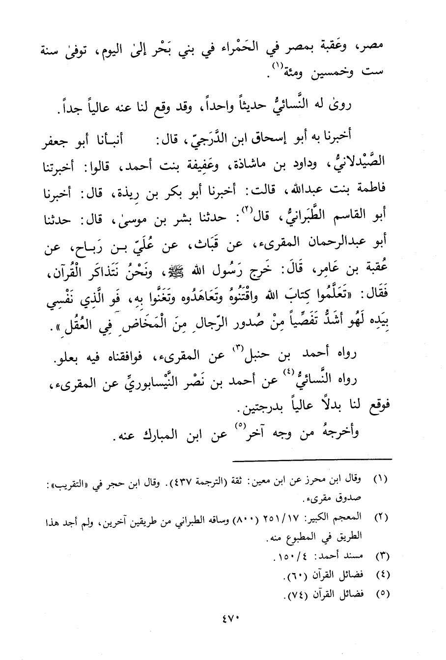 أَخْبَرَنَا بِهِ أَبُو إِسْحَاقَ ابْنُ الدَّرَجِيِّ، قال: أنبأنا أَبُو جَعْفَرٍ الصَّيْدَلانِيُّ، ودَاوُدُ بْنُ مَاشَاذَةَ، وعَفِيفَةُ بْنت أحمد، قَالُوا: أخبرتنا فاطمة بِنْتُ عَبد اللَّهِ، قَالَتْ: أخبرنا أَبُو بَكْرِ بْنُ رِيذَةَ، قال: أخبرنا أَبُو الْقَاسِمِ الطَّبَرَانِيُّ، قال (2) : حَدَّثَنَا بشر بْن موسى، قال: حَدَّثَنَا أَبُو عَبْدِ الرَّحْمَنِ الْمُقْرِئُ، عَنْ قَبَاثٍ، عَنْ عَلِيِّ بْنِ رَبَاحٍ، عَنْ عُقْبَةَ بْنِ عَامِرٍ، قال: خَرَجَ رَسُولُ اللَّهِ صَلَّى اللَّهُ عَلَيْهِ وسَلَّمَ، ونَحْنُ نَتَذَاكَرُ الْقُرْآنَ، فَقَالَ: "تَعَلَّمُوا كِتَابَ اللَّهِ واقتنوه وتعاهدوه وتغنوا به، فو الذي نَفْسِي بِيَدِهِ لَهُوَ أَشَدُّ تَفَصِّيًا مِنْ صُدُورِ الرِّجَالِ مِنَ الْمَخَاضِ فِي الْعُقُلِ.
