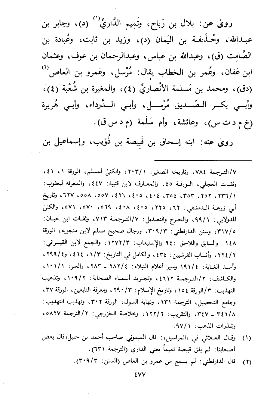 (1) وَقَال العلائي في "المراسيل": قال الميموني صاحب أحمد بن حنبل: قال بعض أصحابنا: لم يلق قبيصة تميما يعني الداري (الترجمة 631) .
