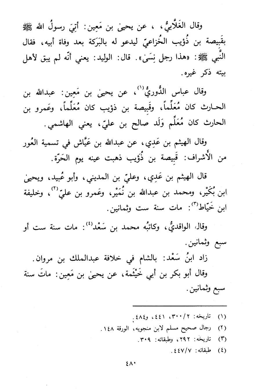 وَقَال الغلابي، عن يحيى بن مَعِين: أتي رَسُول اللَّهِ صَلَّى اللَّهُ عليه وسلم بقبيصة بْن ذؤيب الخزاعي ليدعو لَهُ بالبركة بعد وفاة أَبِيهِ، فقَالَ النَّبِيّ صَلَّى اللَّهُ عَلَيْهِ وسَلَّمَ: "هذا رَجُلٌ نِسَي ". قال: الْوَلِيدُ: يَعْنِي أَنَّهُ لَمْ يَبْقَ لأَهْلُ بَيْتِهِ ذَكَرَ غَيْرَهُ.
