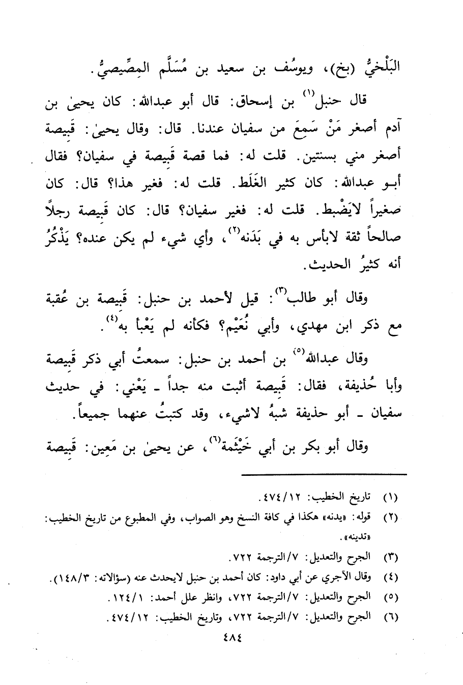 (6) الجرح والتعديل: 7 / الترجمة 722، وتاريخ الخطيب: 12 / 474.