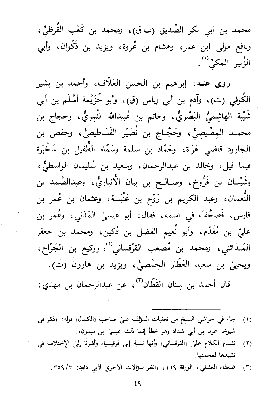 (1) جاء في حواشي النسخ من تعقبات المؤلف على صاحب (الكمال) قوله: (ذكر في شيوخه عون ابن أَبي شداد وهو خطأ إنما ذلك عيسى بن ميمون) .
