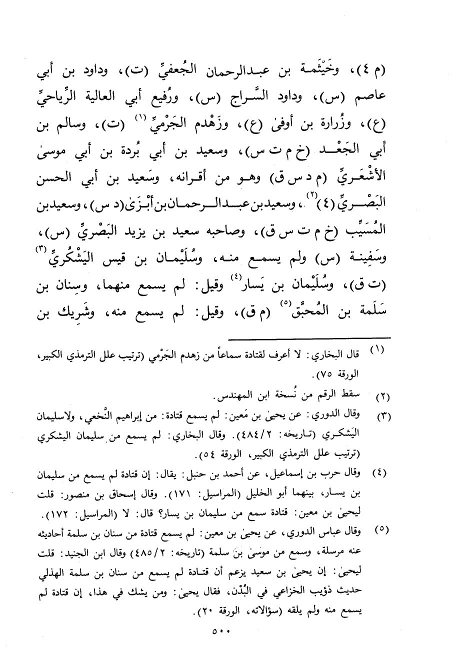 (4) وَقَال حرب بْن إِسْمَاعِيل، عَن أحمد بن حنبل: يقال: أن قَتَادَة لم يسمع من سُلَيْمان بن يسار، بينهما أبو الخليل (المراسيل: 171) . وَقَال إسحاق بن منصور: قلت ليحيى بن مَعِين: قتادة سمع من سُلَيْمان بن يسار؟ قال: لا (المراسيل: 172) .