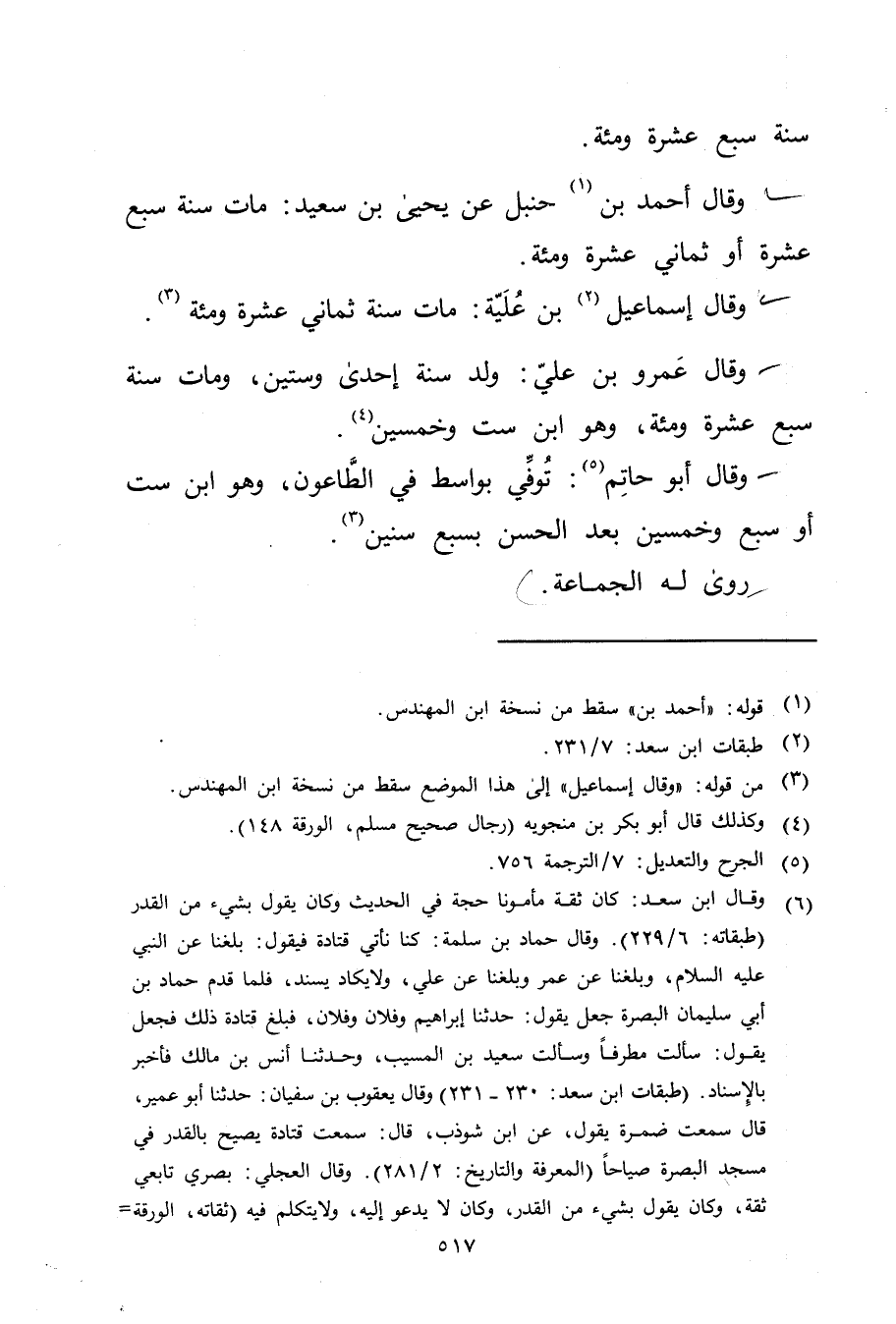 وَقَال أَحْمَد بْن (1) حنبل عَنْ يحيى بْن سَعِيد: مات سنة سبع عشرة أو ثماني عشرة ومئة.