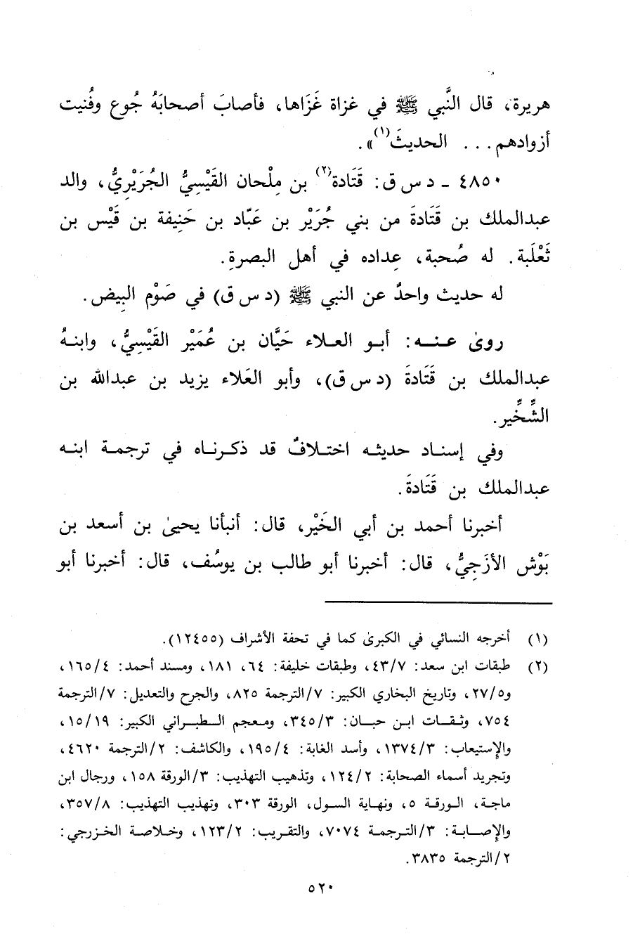4850 - د س ق: قتادة بن ملحان القيسي الجريري (2) ، والد عَبد المَلِك بْن قتادة من بني جرير بْن عباد بْن حنيفة بْن قيس بْن ثعلبة. لهُ صُحبَةٌ، عداده فِي أهل البصرة.