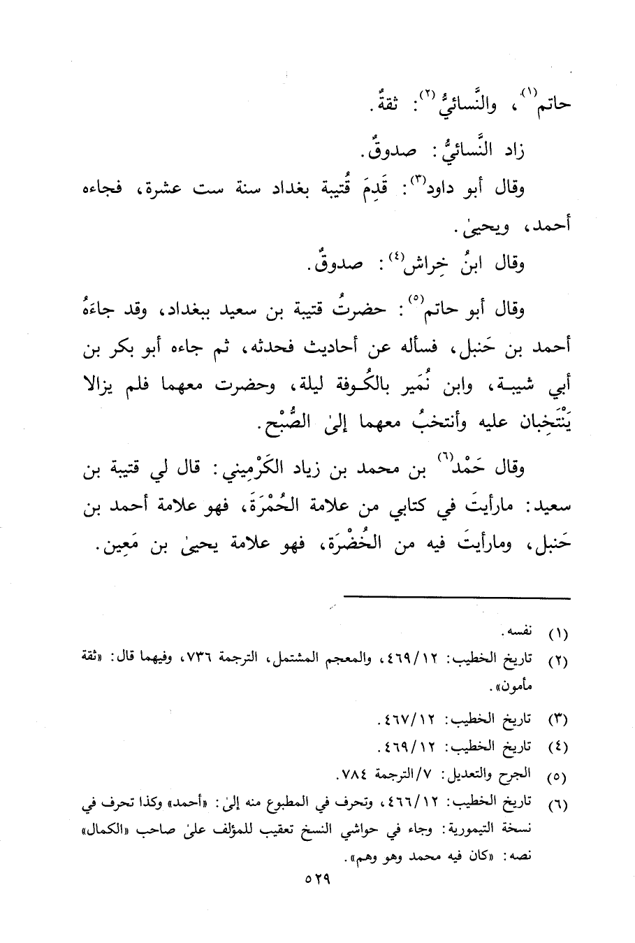 وَقَال حمد (6) بْن مُحَمَّد بْن زياد الكرميني: قال لي قتيبة بْن سَعِيد: ما رأيت في كتابي من علامة الحمرة، فهو علامة أَحْمَد بْن حنبل، وما رأيت فيه من الخضرة، فهو علامة يحيى بن مَعِين.