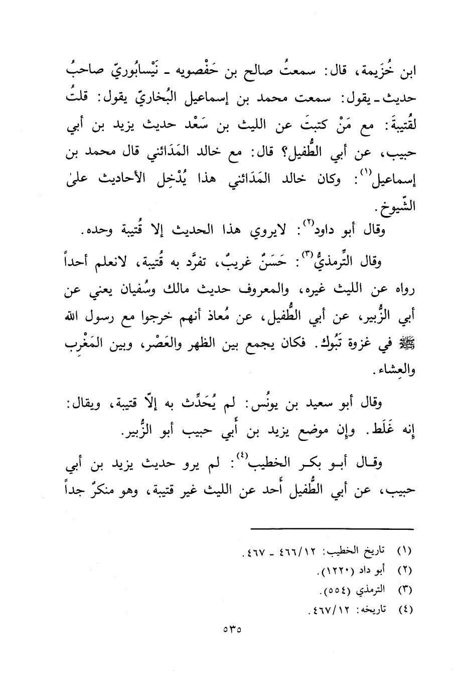 وَقَال أَبُو بَكْر الخطيب (4) : لم يرو حديث يزيد بْنِ أَبي حَبِيبٍ، عَن أَبِي الطفيل أحد عَنِ الليث غير قتيبة، وهو منكر جدا