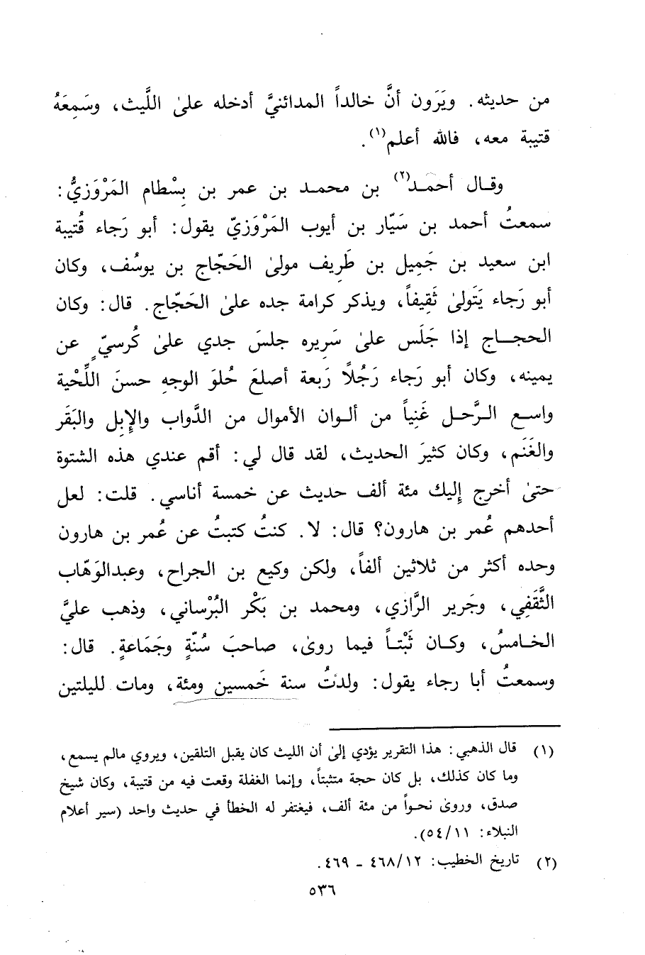 (1) قال الذهبي: هذا التقرير يؤدي إلى أن الليث كان يقبل التلقين، ويروي ما لم يسمع، وما كان كذلك، بل كان حجة متثبتا، وإنما الغفلة وقعت فيه من قتيبة، وكان شيخ صدق، وروى نحوا من مئة ألف، فيغتفر له الخطأ في حديث واحد (سير أعلام النبلاء: 11 / 54) .